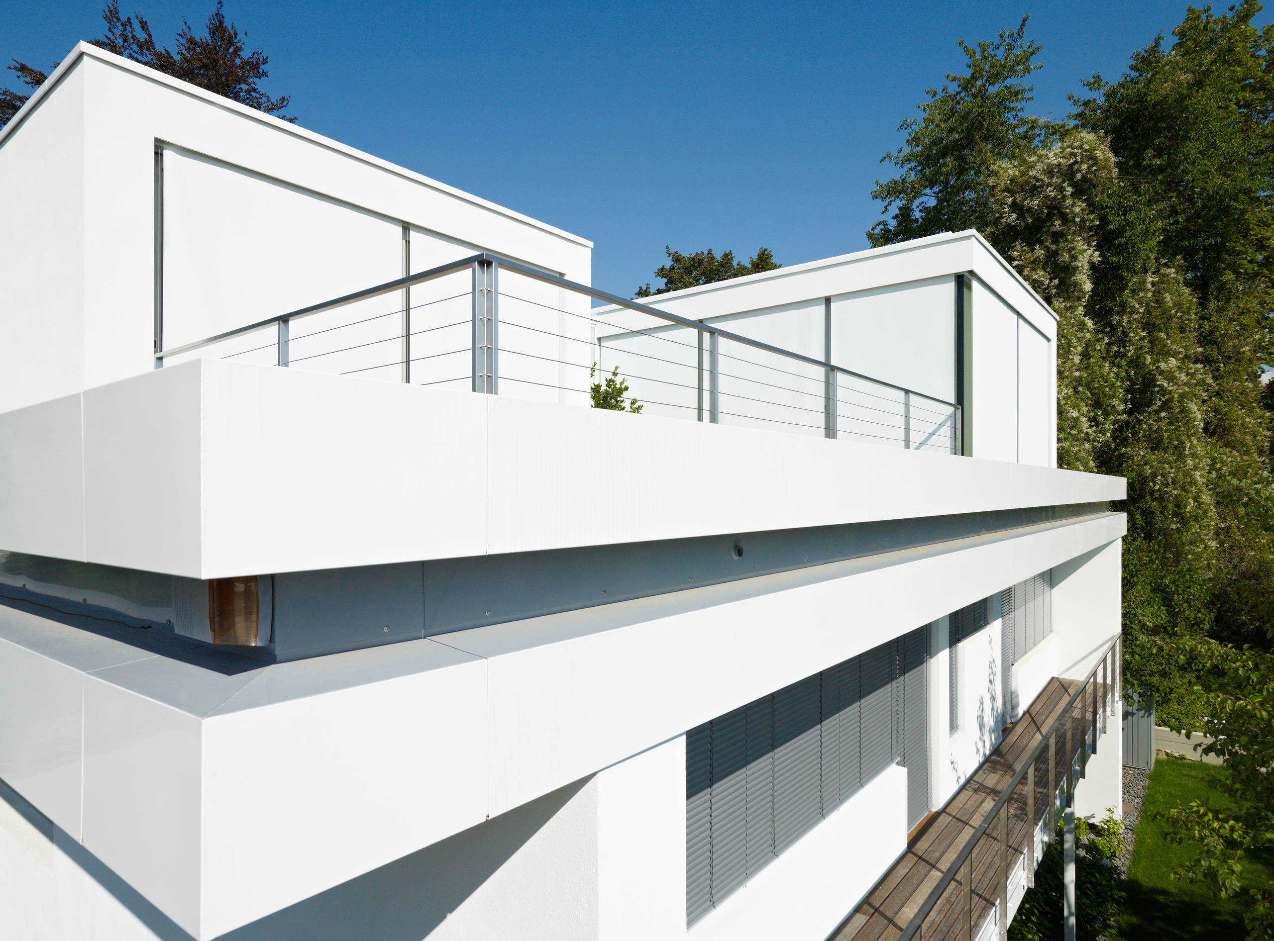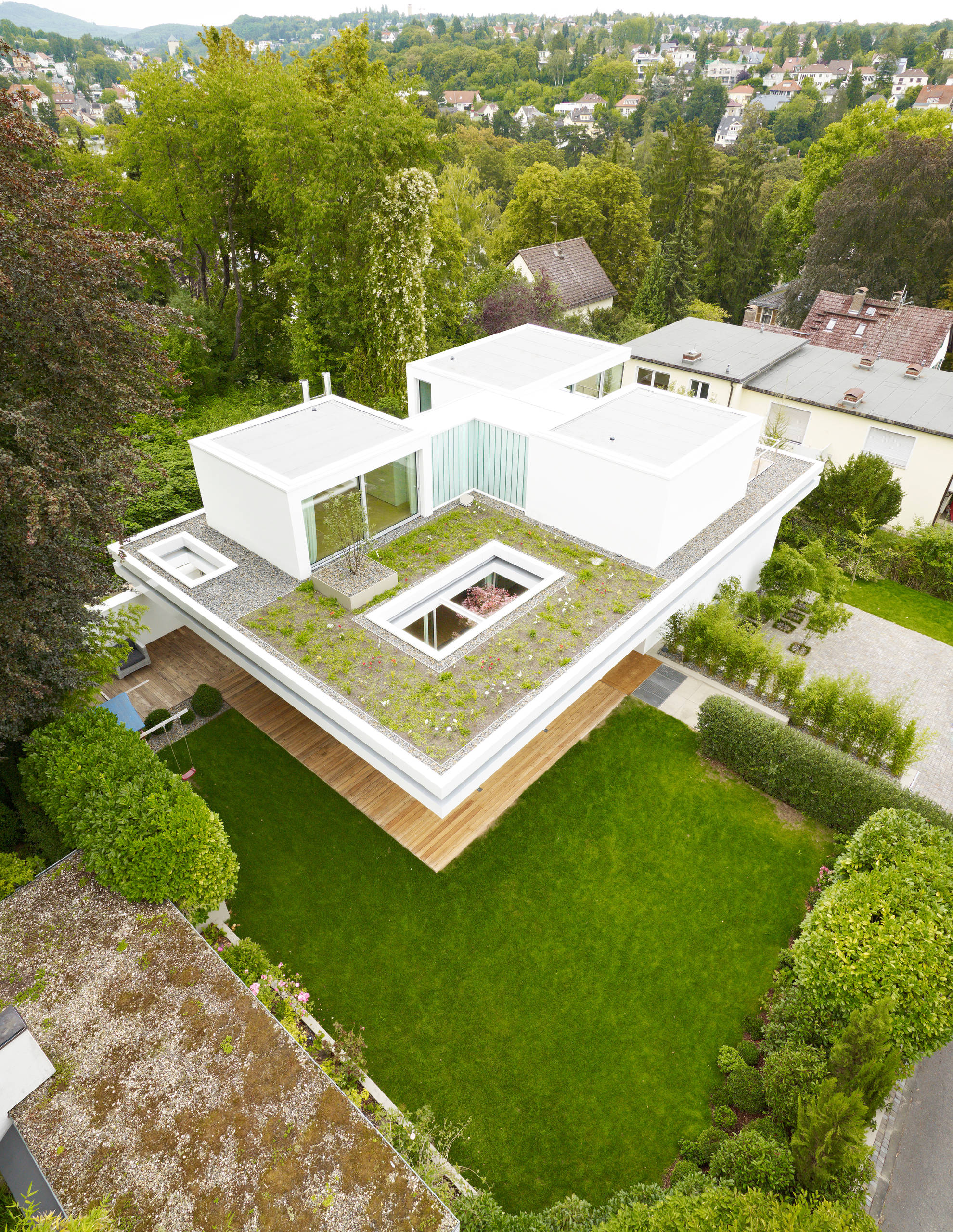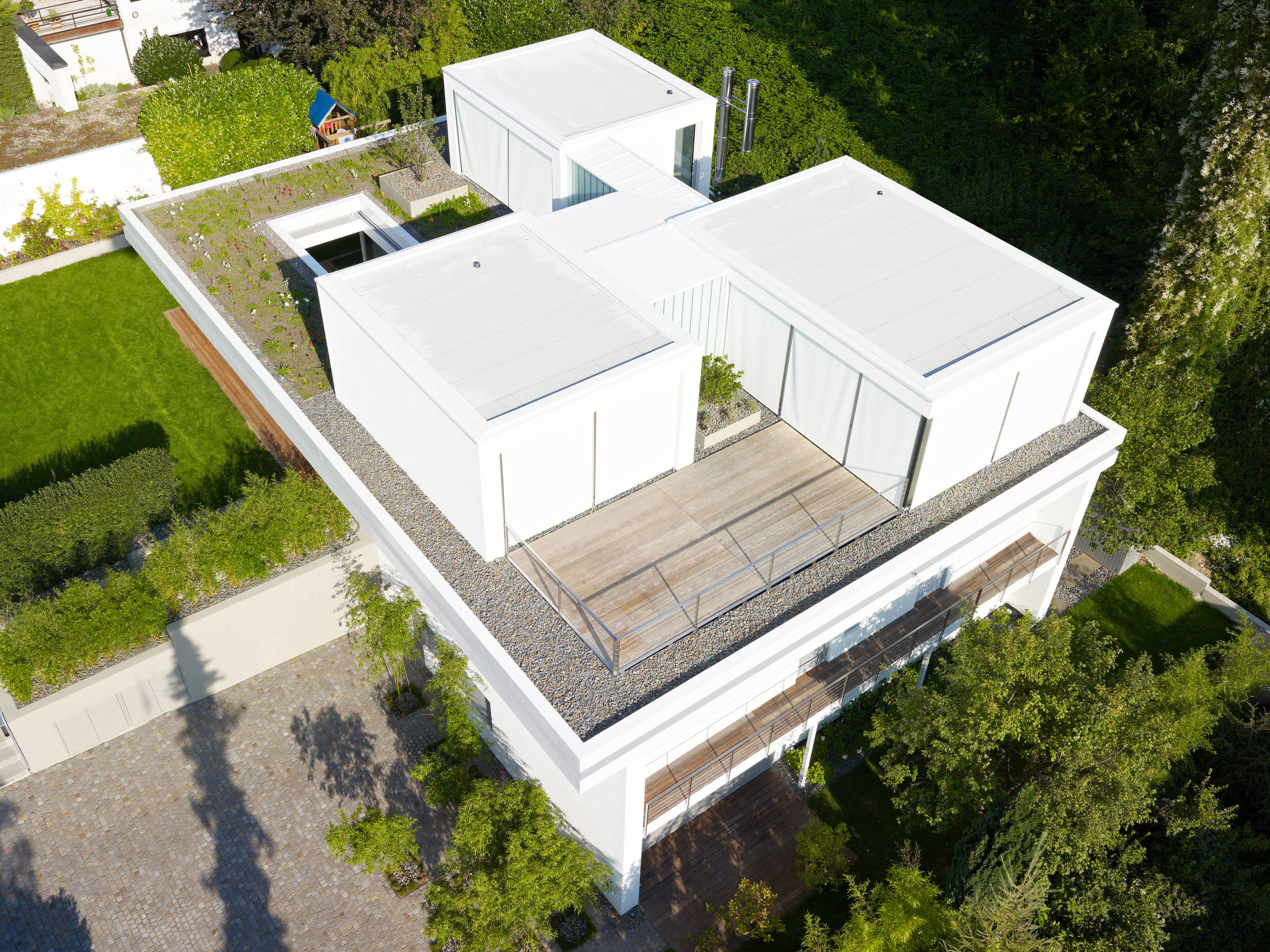 Die neuen Besitzer wünschten sich großzügigeren Wohnraum und wollten den Bungalow daher erweitern. „Wir hätten ihn auch abreißen und ganz neu bauen können“, erinnert sich Architekt Roger Christ. Das aber schien ihm die letzte Option. Er machte den architekturbegeisterten Bauherren daher den Vorschlag, die Dachfläche als Bauland zu betrachten. Die Idee und der Entwurf von Christ und seinem Team überzeugten. Die neu entstandenen Baukörper nehmen die Vor- und Rücksprünge des Bestandsgebäudes auf. Zwischen den in Holztafelbau errichteten Boxen auf dem Dach sind zudem drei verschiedene Außenflächen entstanden.