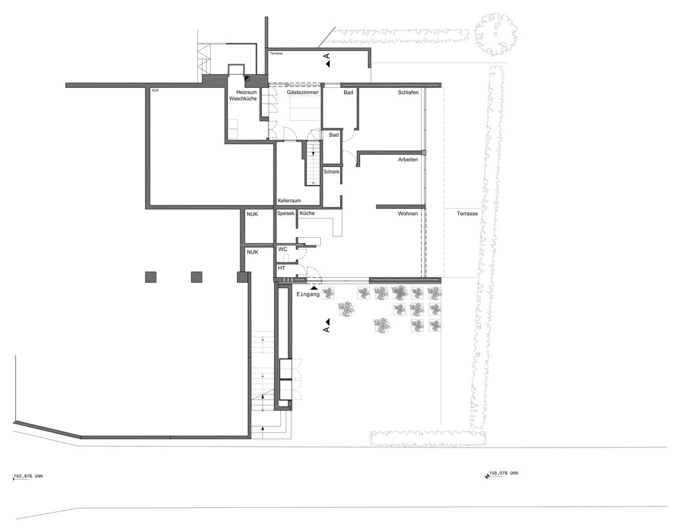 Das Gästezimmer mit eigenem Bad liegt im Untergeschoss. Neben den Kellerräumen ist hier zudem eine geräumige Einliegerwohnung untergebracht, die den Bauherren auch als Altersabsicherung dient.