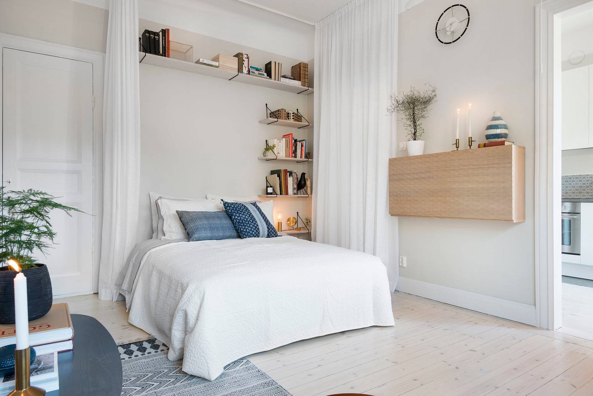 Große Nischen in Einzimmerwohnungen gliedern den Raum von ganz allein. Versuchen Sie, solche architektonischen Gegebenheiten ins Einrichtungskonzept zu integrieren und mit ihrer Hilfe Zonen zu schaffen. Vorsprünge verhindern direkte Blickbeziehungen – hier aufs Bett – und vermitteln etwas mehr Privatsphäre. Haushaltsgeräte können in kleineren Nischen, zum Beispiel hinter einem Vorhang, gut verstaut werden. Auch mit Einbauschränken nutzen Sie den Raum optimal.