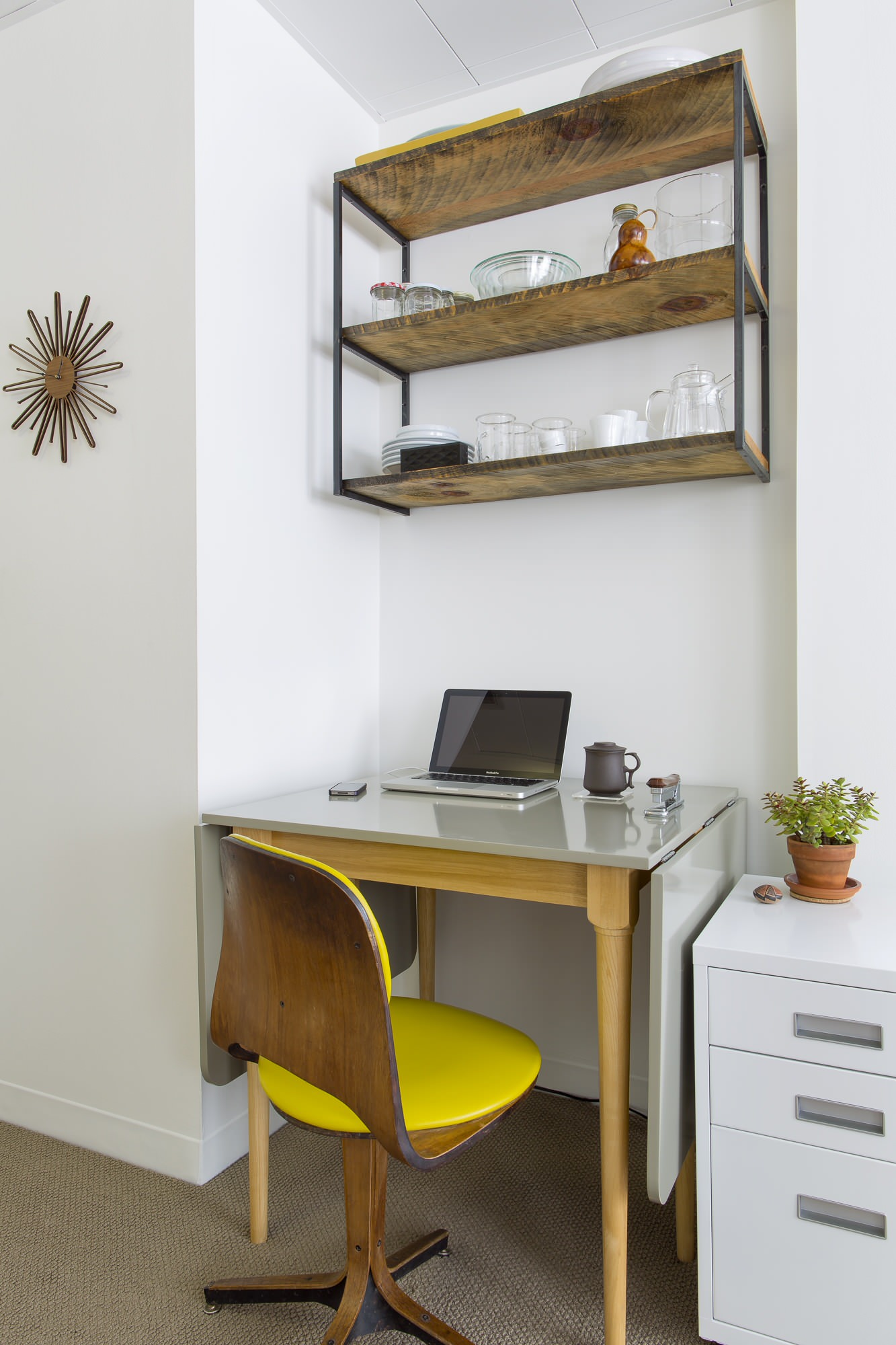 Ebenso praktisch sind ausklappbare Möbel, die man bei Nichtbenutzung vollständig verstauen kann. Erst Schlafzimmer, dann Arbeitsbereich – sowohl Bett als auch Schreibtisch können in diesem Zimmer eingeklappt werden.
