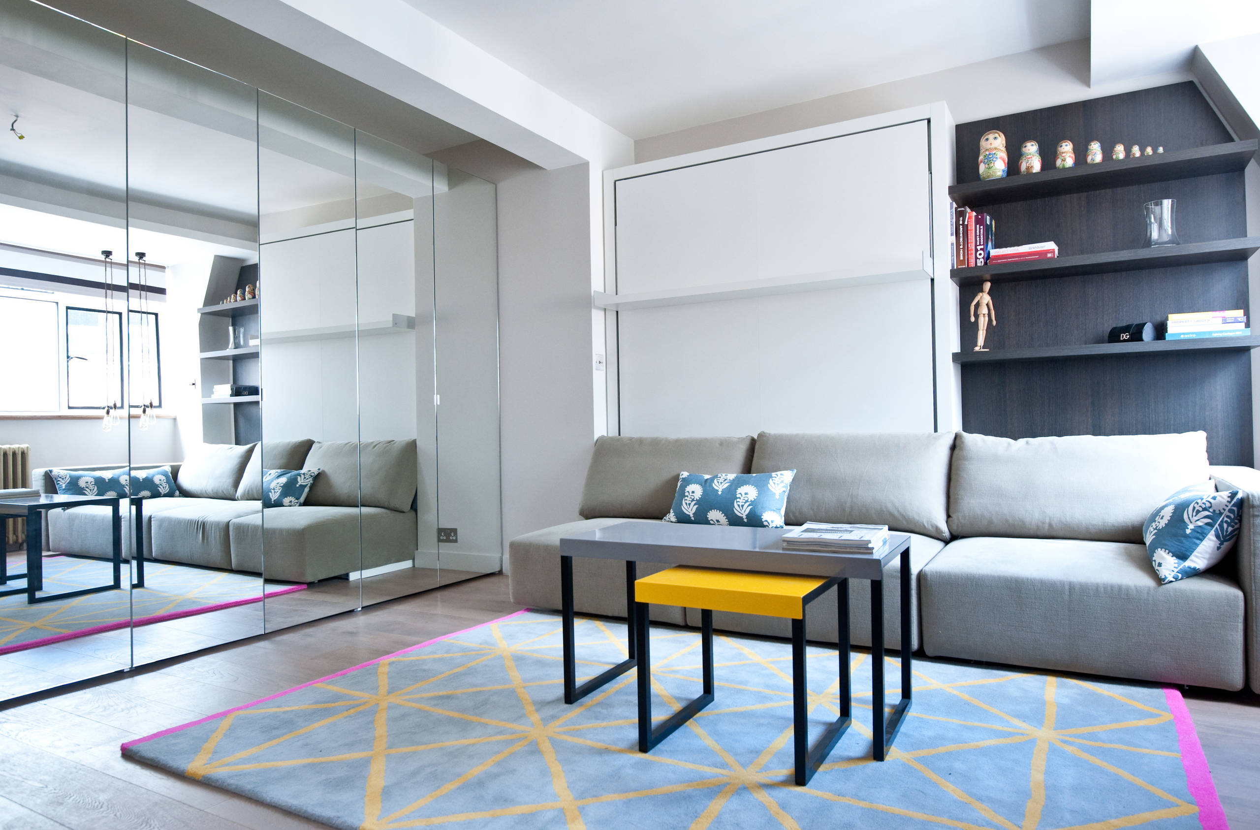 Kleine Zimmer mit vielen Möbeln oder Raumteilern wirken meist düster. Spiegel vergrößern sie optisch und bringen mehr Helligkeit in dunkle Ecken. Ein Schrank mit Spiegelfronten oder große Wandspiegel sind daher ideal, um Einraumwohnungen in einem guten Licht zu präsentieren.