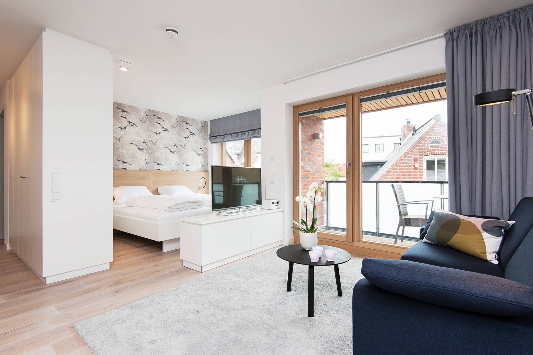 Genauso wie in der Vertikalen können Funktionsbereiche auch in der Waagerechten gekennzeichnet werden. Mithilfe verschiedener Bodenbeläge gelingt die visuelle und haptische Einteilung. So etwa mit einem Teppich im Wohnbereich, Dielen im Schlafzimmer und Fliesen in der Küche.
