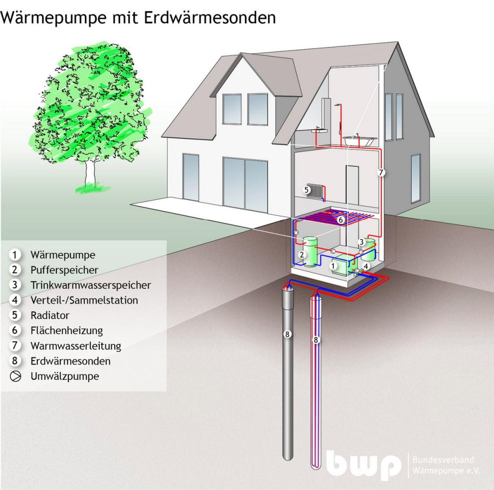 So sollte zum einen das Grundstück ausreichend groß sein, zum anderen sollte bei der Sanierung auf eine gute Dämmung geachtet werden und darauf, dass eine Flächenheizung mit niedriger Vorlauftemperatur auf Boden, Decke oder Wänden möglich ist. Denn die Wärmepumpe arbeitet umso effizienter, je niedriger der zu überbrückende Temperaturunterschied zwischen Erdwärme und benötigter Vorlauftemperatur der Heizung ist.