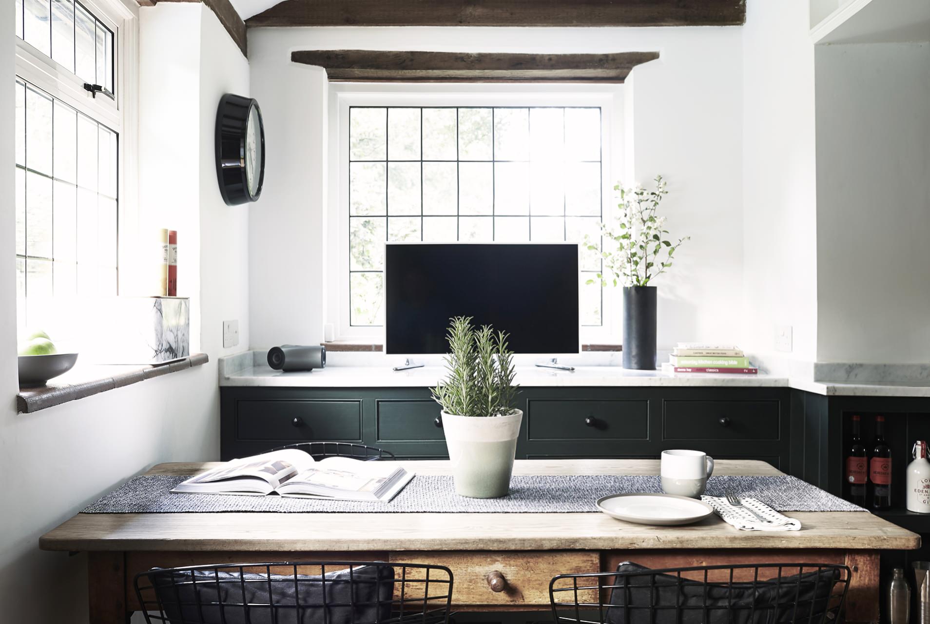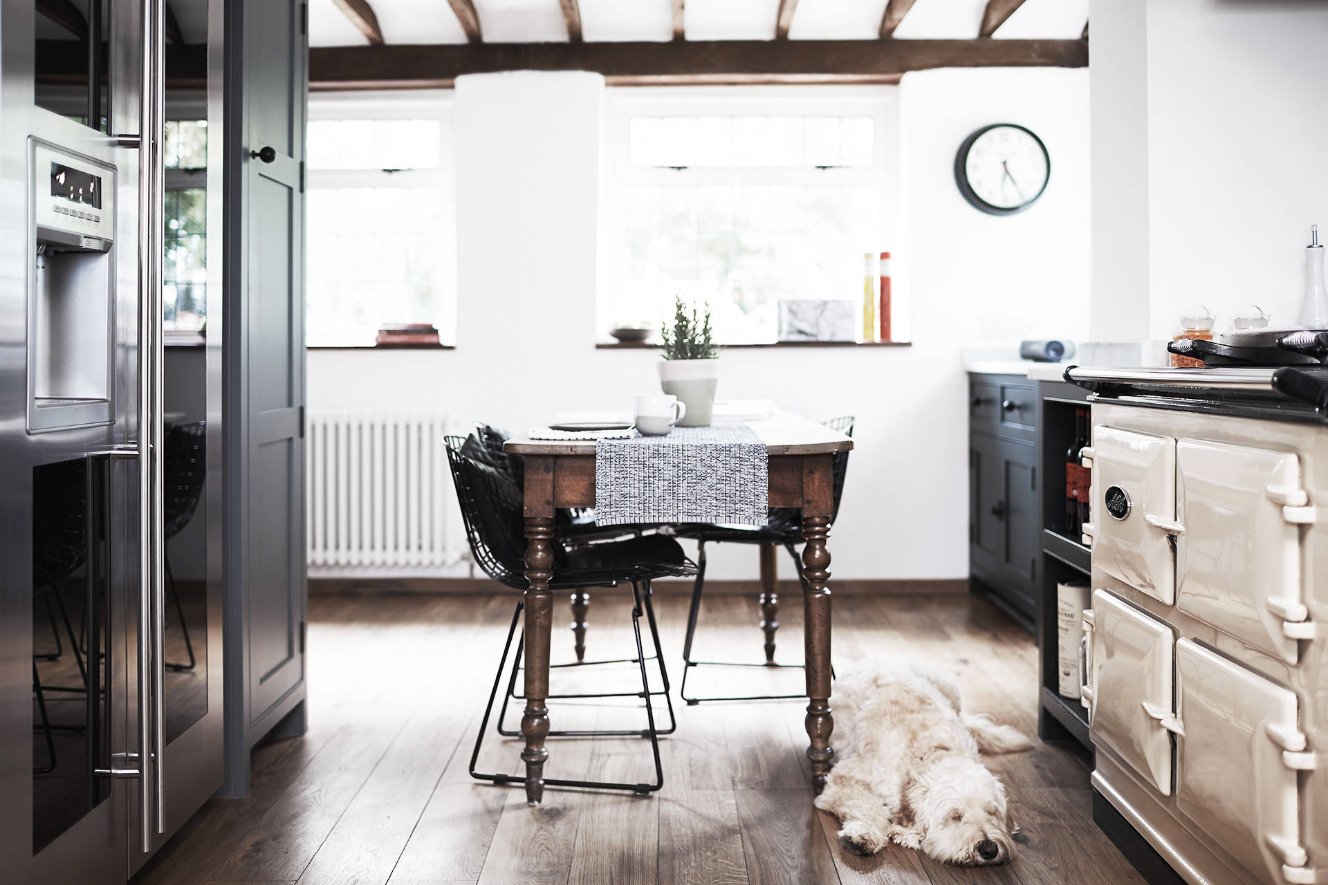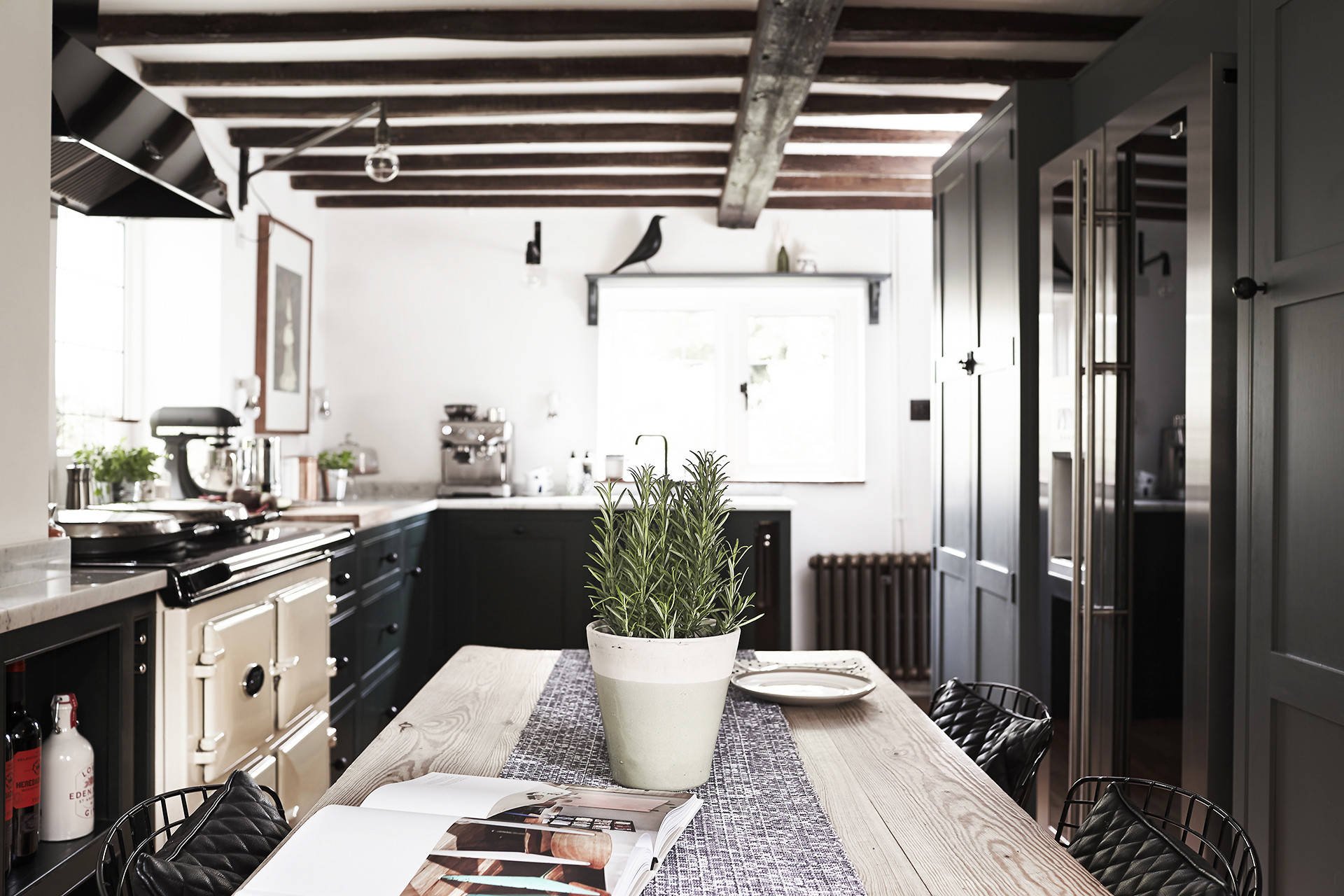 Freigelegte Deckenbalken, ein cremefarbener Range Cooker von Aga und eine grob gebürstete Tischplatte: Traditionelle Elemente prägen diese Küche. Aber dank zeitgenössischer Zutaten wie einer schnittigen Dunstabzugshaube und einem hochmodernen Kühlschrank eignet sich der Raum wunderbar für den Alltag einer Familie im 21. Jahrhundert.