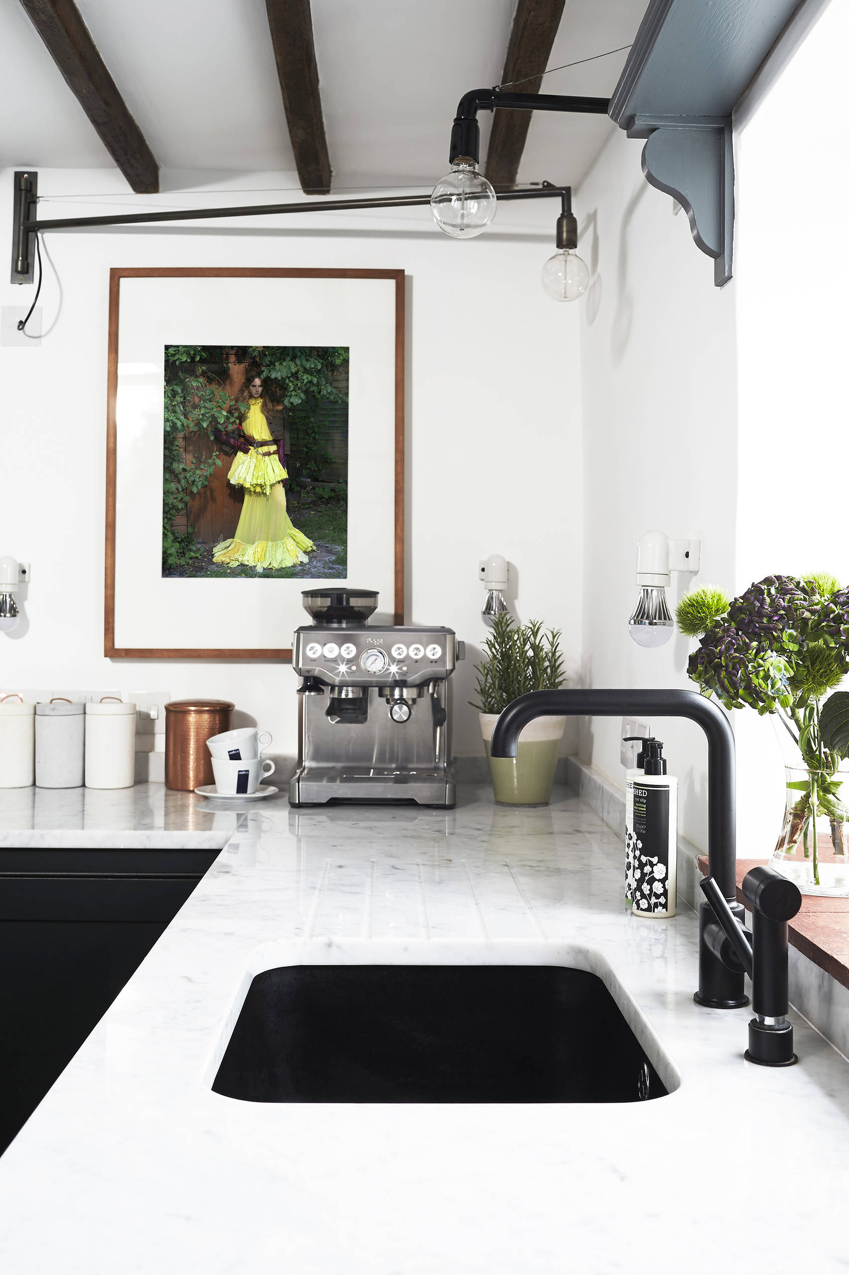 Industrial-Schwenkarmleuchte und Pipe-Wandleuchte (schwarz): House Doctor; Wandleuchte Winkelfassung (weiß): Thpg; Espressomaschine: Barista Express, Sage by Heston Blumenthal; Wasserhahn: Purist, Kohler; Wandbild: Rta Gallery