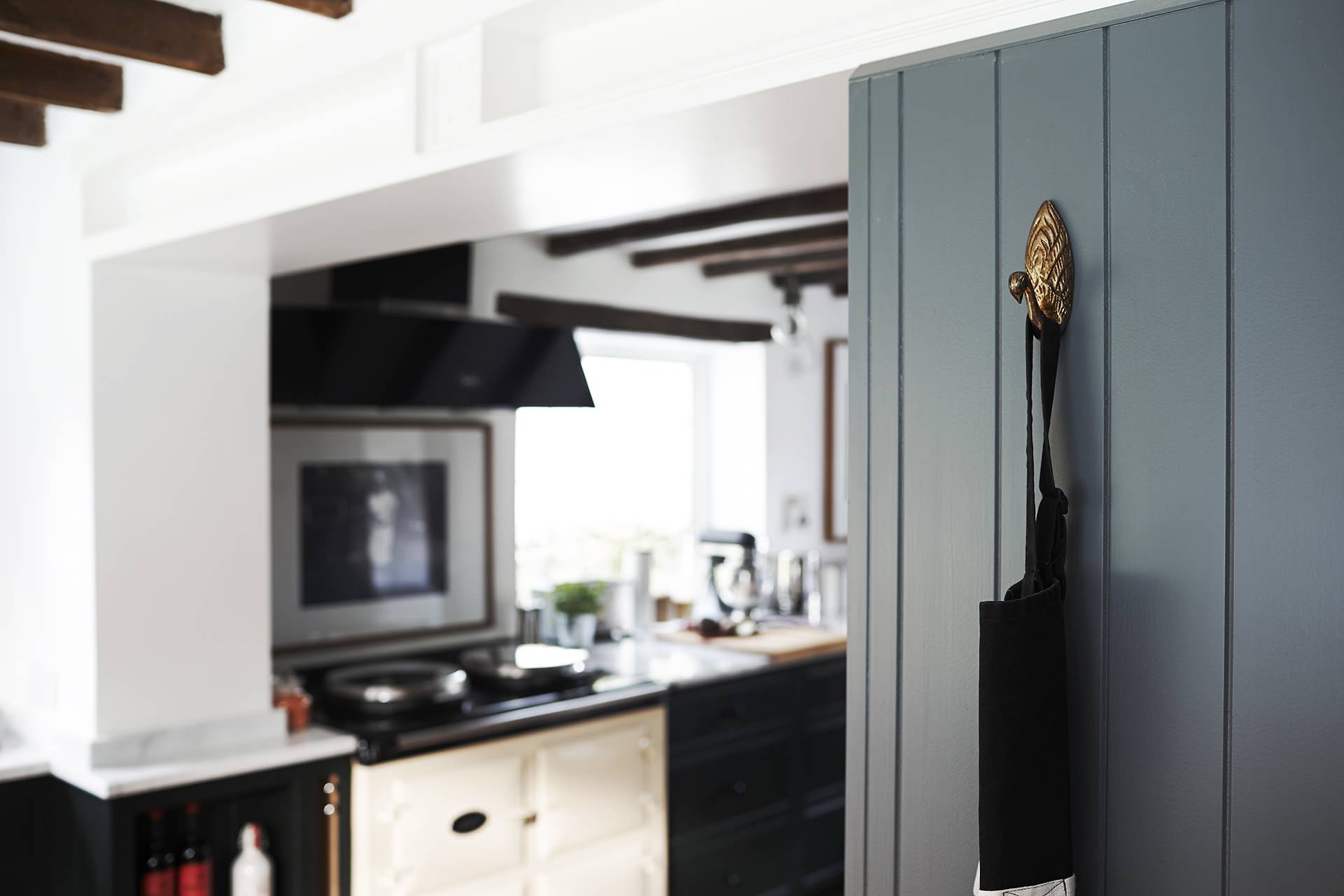 Der Range Cooker unterstreicht den rustikalen Look. Gleichzeitig verfügt er über eine hochmoderne Dunstabzugshaube: „Die hat uns wirklich sehr gut gefallen“, berichtet Allen. „Vorher hatten die Eigentümer einen eingebauten Rauchfang, der ausgesprochen klobig wirkte – deshalb haben wir ihn entfernt. Diese Dunstabzugshaube passt zu dem leichten Industrial-Stil, der hier herrscht.“ Andere Elemente wie der schwanenförmige Haken in Antikgold sorgen für Atmosphäre. „Dieses kleine Detail hat seinen eigenen Reiz, fanden wir. Mit edlen Einzelteilen aus Metall lässt sich ein Raum gut aufwerten.“