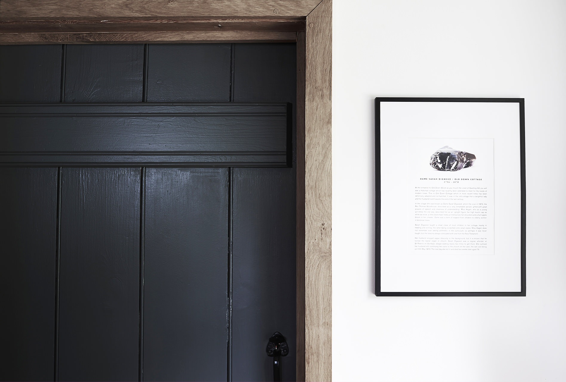 Diese Tür führt zum Hintereingang des Hauses, der dem Garten zugewandt ist. „Der gerahmte Druck schildert die Geschichte des Cottages, die wir für die Familie aufgeschrieben haben“, erklärt Allen. „Es ist immer schön, einem Projekt eine persönliche Note zu geben.“