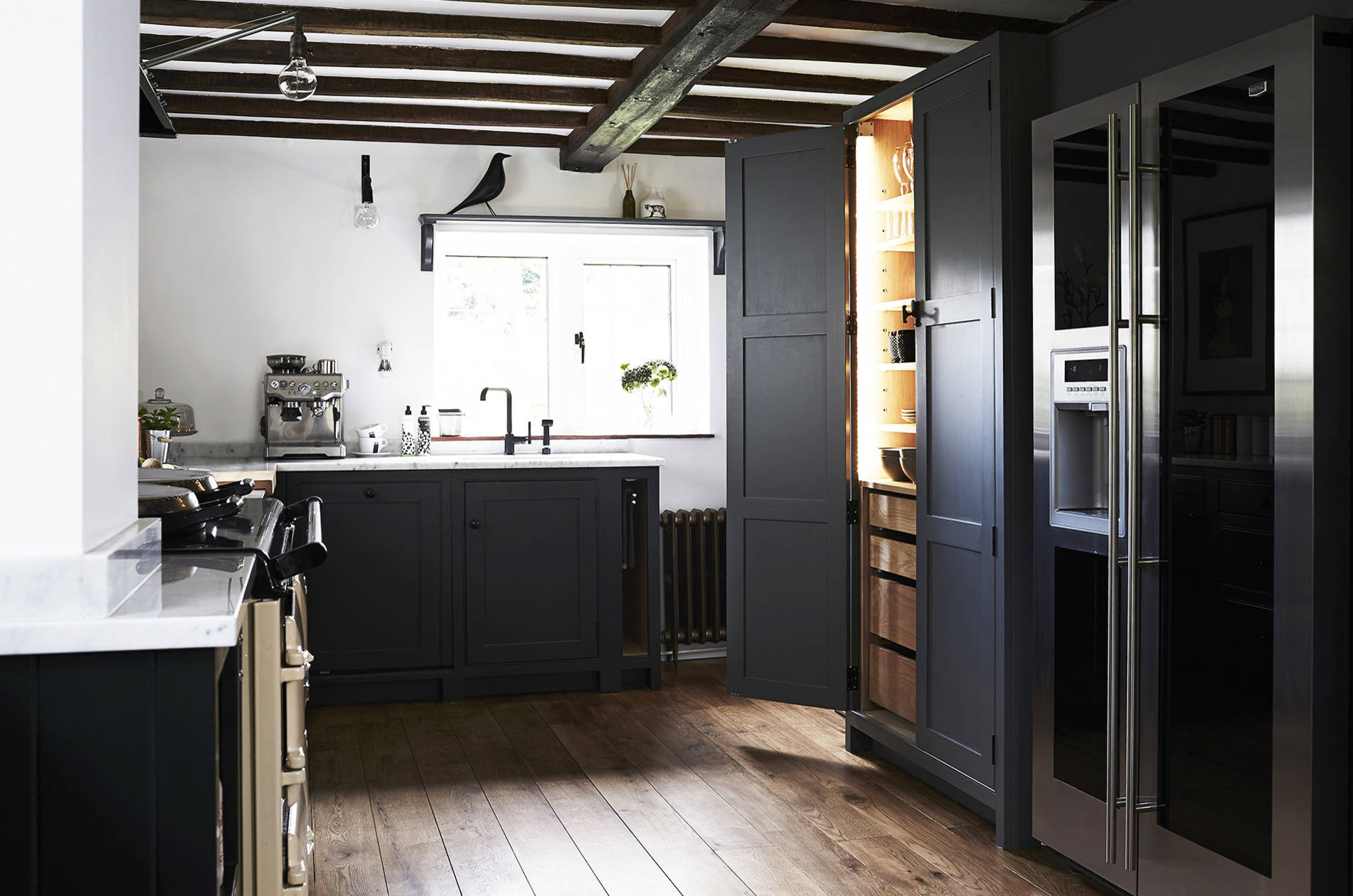 Neben dem Vorratsschrank steht eine Kühl-Gefrier-Kombination im amerikanischen Stil. „Das Gerät gibt dem Raum einen modernen Touch“, sagt Allen. „Hätten wir es in die Wand integriert, dann hätte das Ganze wahrscheinlich eine etwas erdrückende Wirkung gehabt, aber so haben wir einen guten Kompromiss geschlossen. Außerdem lieben die Kinder den eingebauten Wasser- und Eis-Spender.“