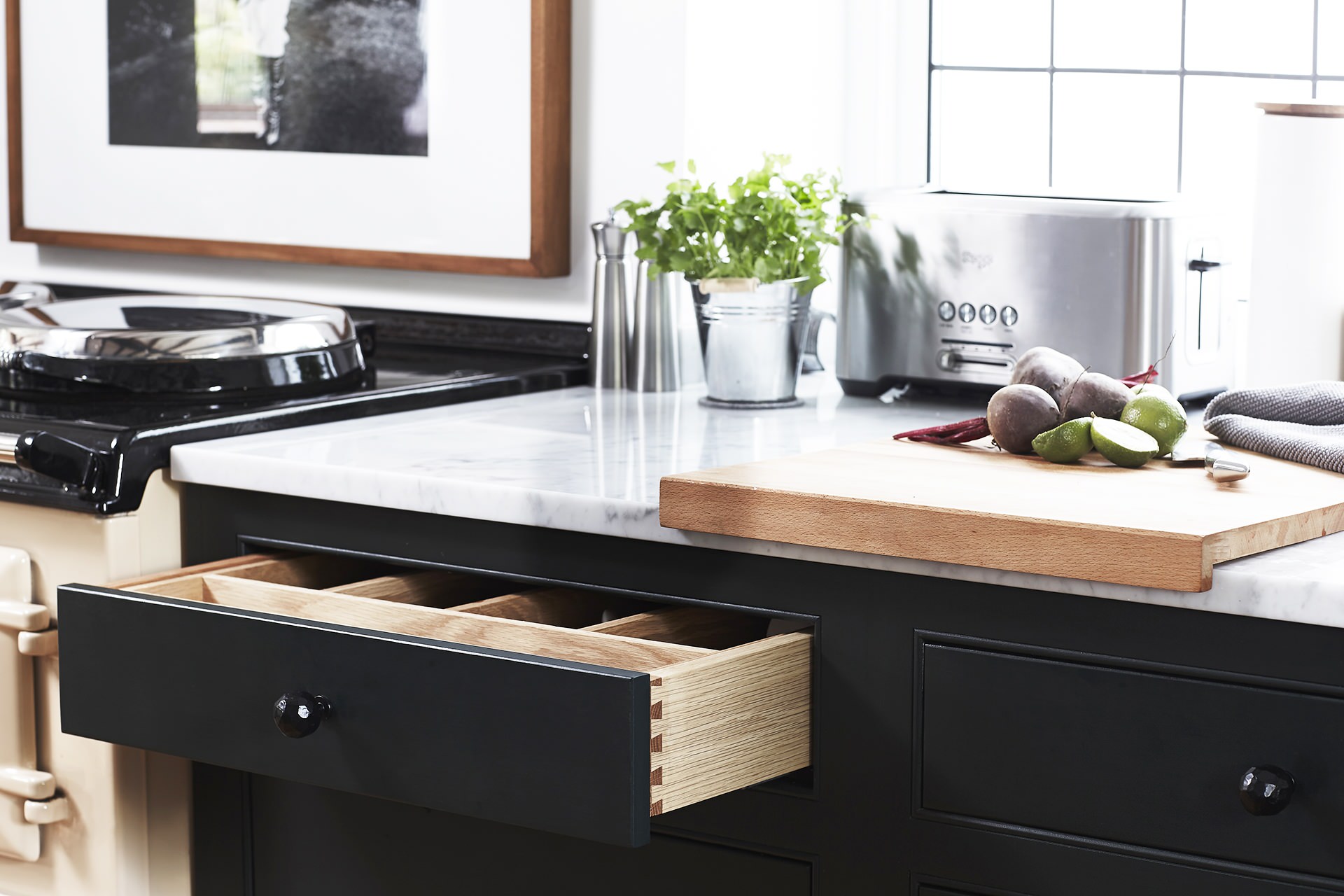 Die maßgefertigten Küchenmöbel wurden per Hand mit strapazierfähigem Eggshell gestrichen. Dadurch wirken sie besonders natürlich. „Wir konnten den Lackierer dazu bringen, so zu streichen, dass hier und da ein paar Pinselstriche erkennbar blieben. So sieht es ein bisschen authentischer aus, nicht wie aus der Fabrik oder der Sprühkammer“, sagt Allen.