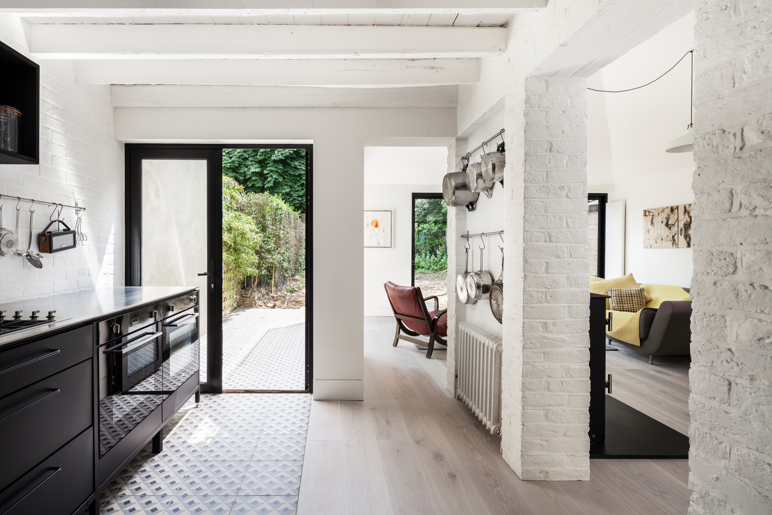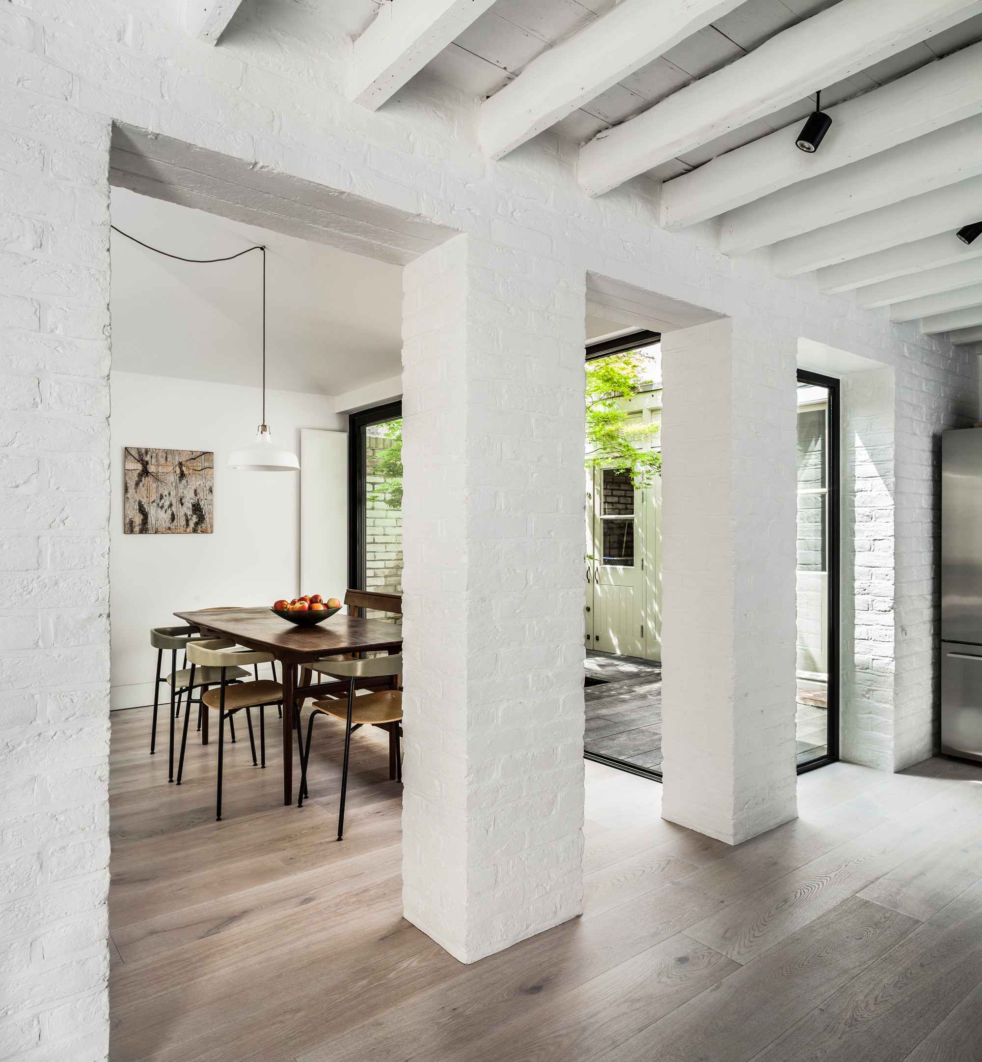 Vor dem Umbau war 70 Jahre lang nicht mehr an dem Haus gemacht worden. „Eigentlich hatten wir gehofft, die ursprüngliche Konstruktion sowie möglichst viele historische Details erhalten zu können, aber die Außenwände sind im Grunde das Einzige, was vom ursprünglichen Haus übrig geblieben ist“, so Kirkwood. „Zwischen Küche und dem neuen Wohn- und Essbereich waren einst Fenster und Türen. Nach der Öffnung haben wir die Türschwellen entfernt und die Backsteinwände weiß gestrichen.“