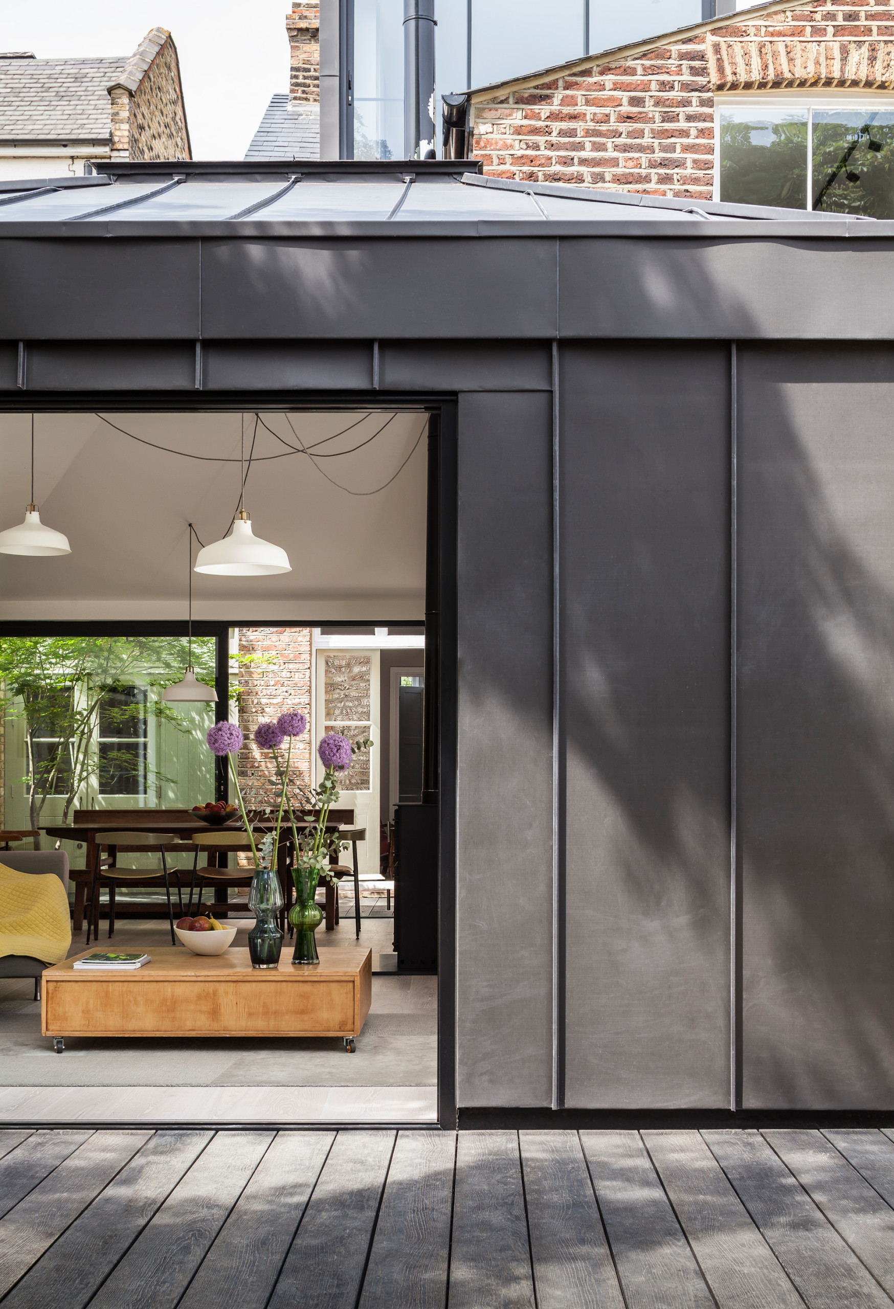 Um den alten und neuen Teil des Hauses klar von einander abzugrenzen, arbeiteten die Architektinnen mit unterschiedlichen Materialien. So verwendeten sie für den neuen Anbau schwarzen Zink, schwarzen Stahl und schlichte Formen, die einen schönen Gegensatz zu dem alten Gebäudeteil mit seinen leicht strukturierten Backsteinen bilden.