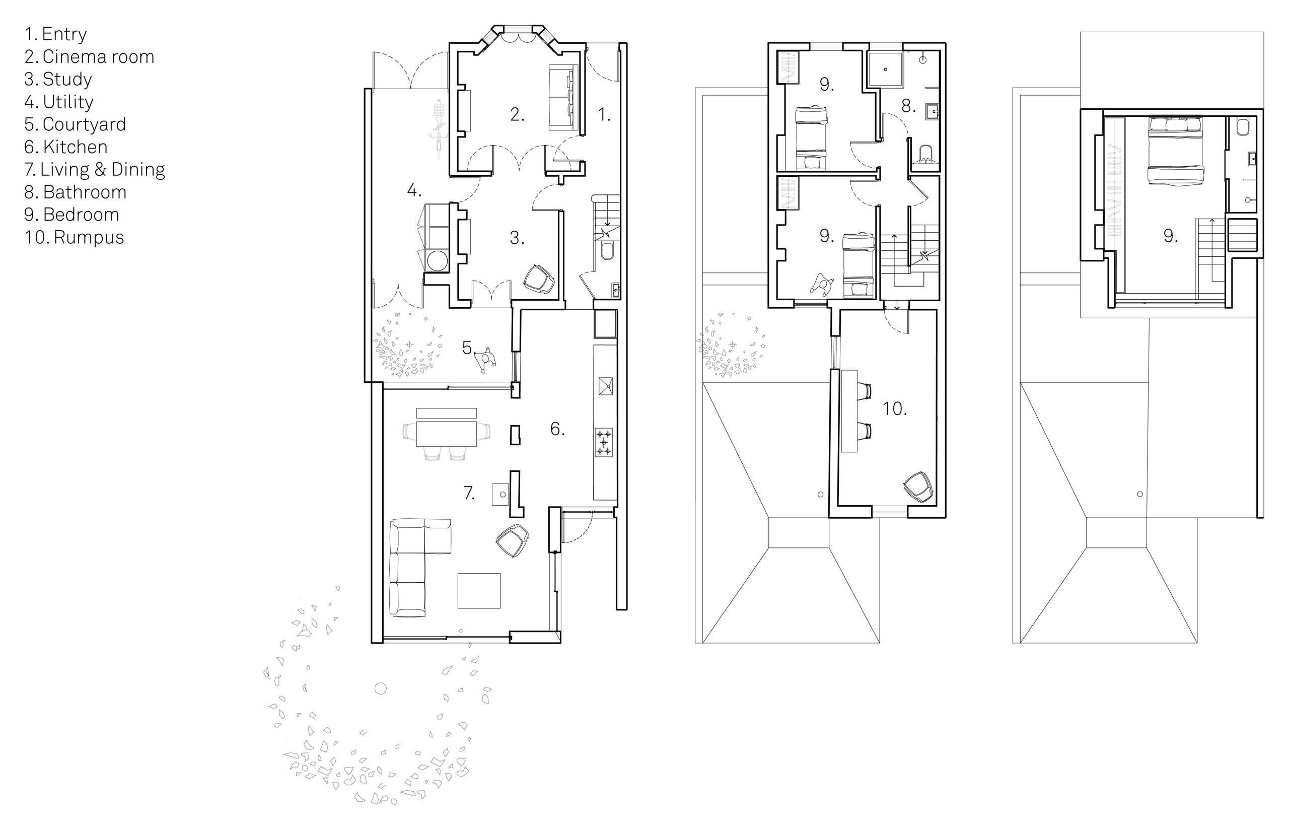 Auf diesen Grundrissen sieht man die neue Raumaufteilung des Hauses – ganz links das Erdgeschoss mit Wohnküche und Innenhof.