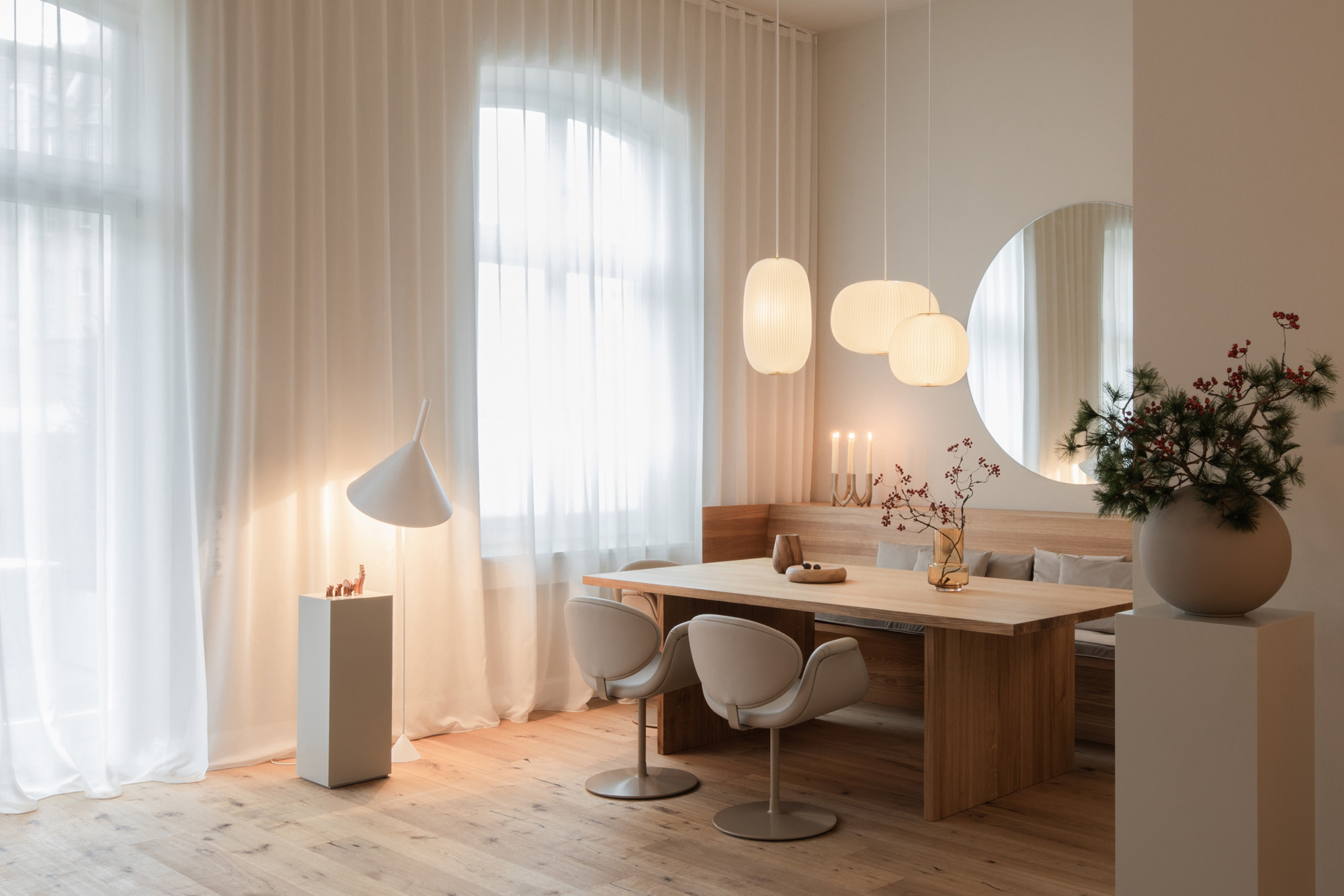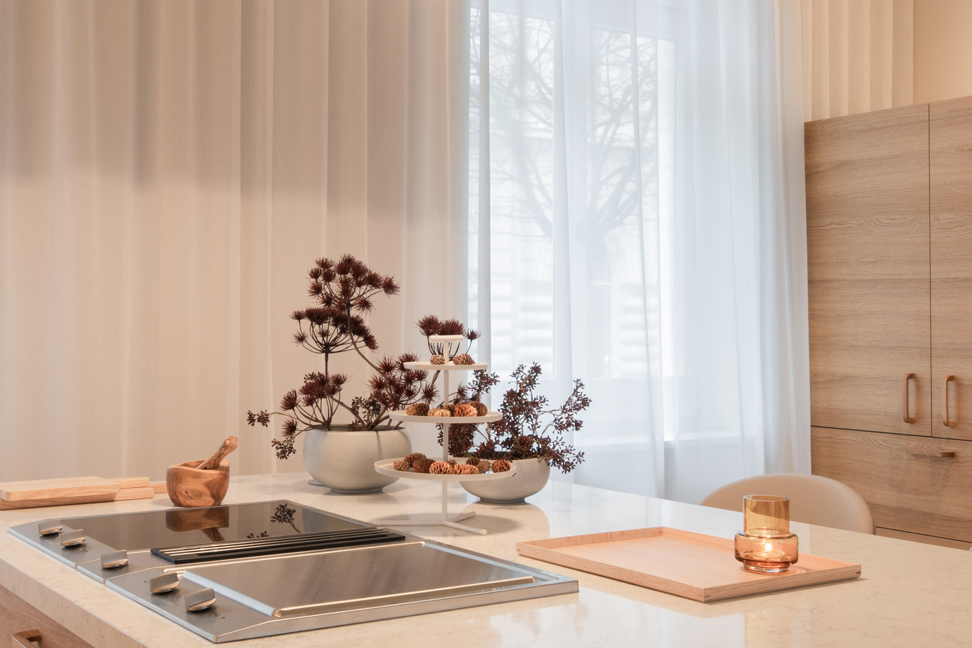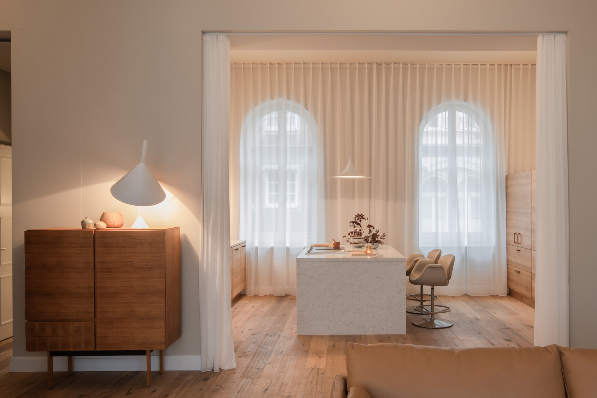 „Die großzügige Küche schließt sich an den offenen Wohnbereich an und ist hiervon durch einen leichten, transparenten Vorhang getrennt, der bei Bedarf geschlossen werden kann“, beschreibt Ladner die Idee, die Küche mit dem Wohnraum zu verbinden – und dennoch optisch abzutrennen.