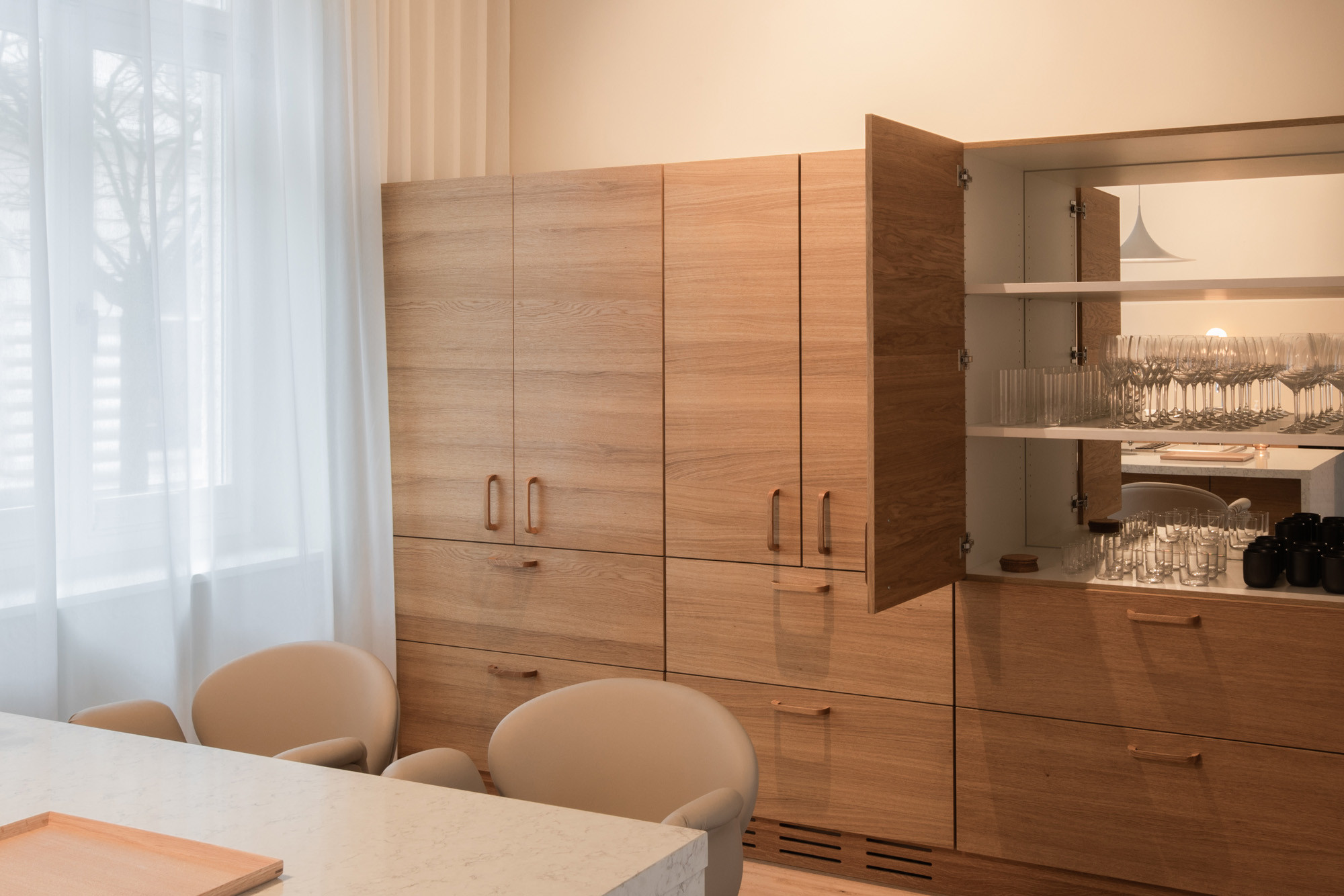 „In den Einbauten an der rechten Seite wurden Kühl- und Gefrierschrank, Mikrowelle, eine Bar und viel Stauraum integriert. Auf Oberschränke an der linken Seite konnte durch den vielen Stauraum verzichtet werden, was die Küche leicht und elegant wirken lässt“, sagt die Interior Designerin.