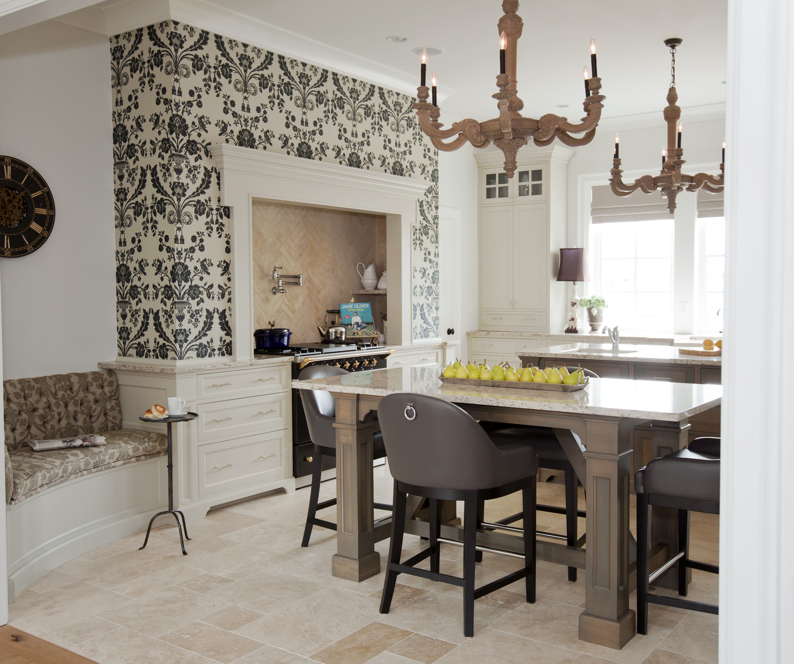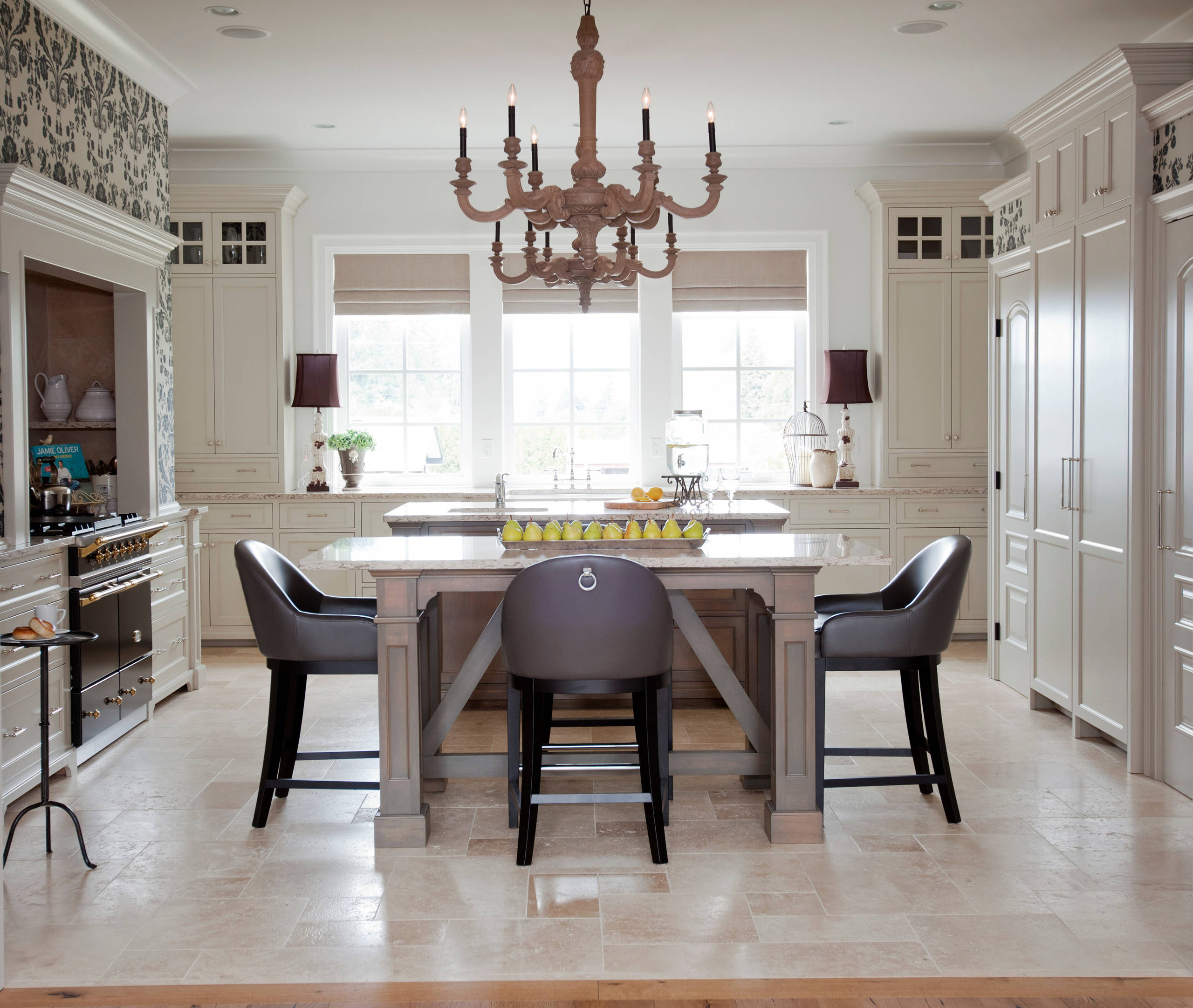 Dass sich ein Interior Designer bei der Planung einer Küche von einem Haushaltsgerät inspirieren lässt, passiert ja eher selten. Es sei denn, es handelt sich dabei um einen Kult-Herd der Firma Lacanche. Karla Barton von McBurneyJunction rahmte den mächtigen Range Cooker mit einer Trockenbauwand und setzte ihn mit Tapete und einem Fliesenspiegel aus Travertin in Szene. Getrennte Ess- und Arbeitsbereiche als optische Inseln und auffällige Hängeleuchten runden das symmetrische Gesamtkonzept des warmen Raums im französischen Landhausstil ab.