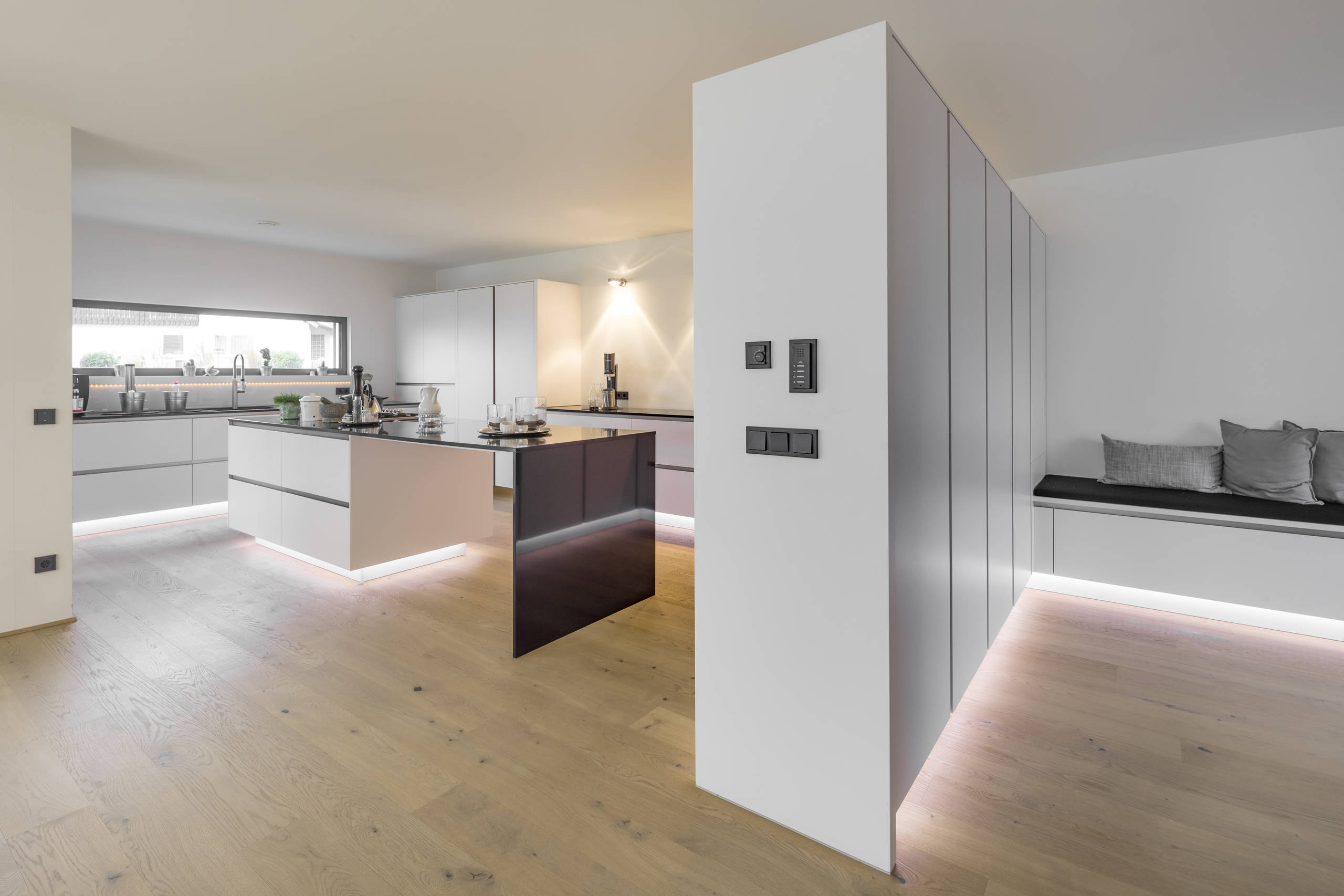 Die Nutzung der Räume bestimmt, wo welche Elektroinstallationen notwendig sind. „Der Bauherr muss sagen, was er in einem Raum machen möchte, wie er sich einrichten will“, erklärt Klügl. Ein Interior-Konzept hilft im Neubau ebenso wie bei der Sanierung von Bestandsgebäuden. Der Bauherr sollte bereits eine Vorstellung davon haben, wohin welche Möbel kommen – zum Beispiel, wo er eine Leseecke haben möchte. „Wenn etwa bei der Küche klar ist, wo die Arbeitsfläche, wo der Herd und wo die Elektrogroßgeräte untergebracht werden, dann lässt sich auch festlegen, wo die Steckdosen angebracht werden müssen“, erklärt Christl. Eine ausgefeilte Elektroplanung macht der Schreinermeister in Zusammenarbeit mit dem Kunden und einem Elektroinstallateur.