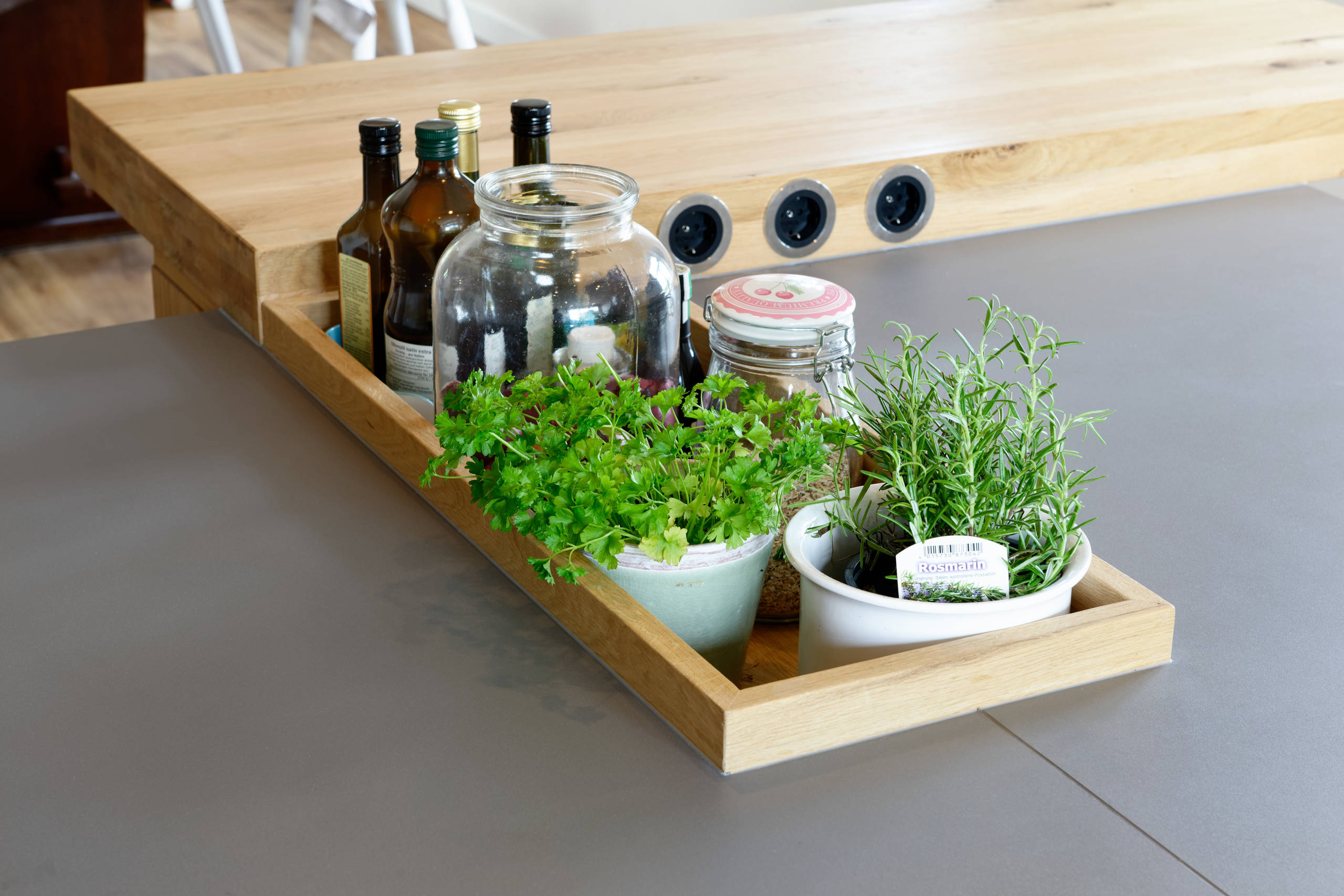 Gerade in Küchen sind Steckdosen in Schränken oder Arbeitsflächen eine flexible Alternative zu Steckdosen in der Wand. Bei einem Umbau lassen sie sich einfach versetzen, wieder direkt im Küchenmöbel, wie hier in einer modernen Bauernhofküche.