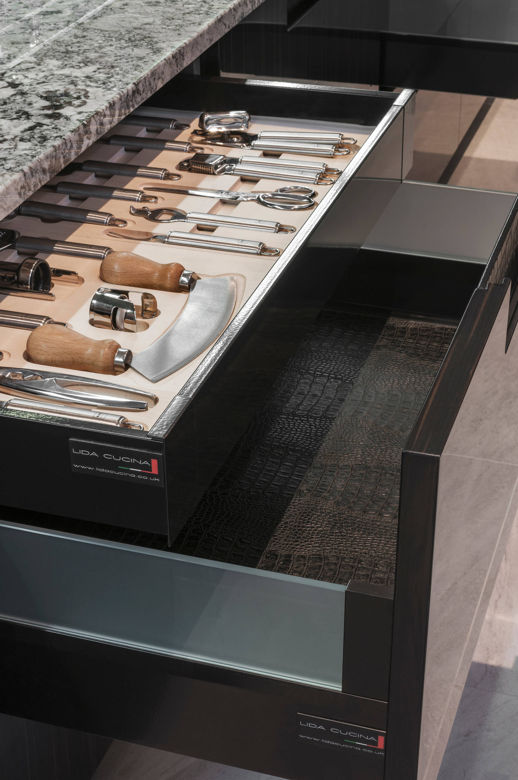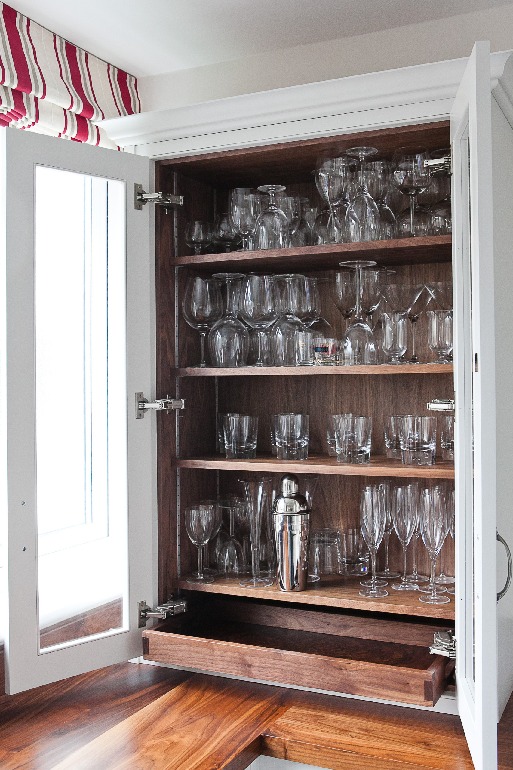 Das Schöne an Schubladen ist, dass sie sich praktisch überall verstecken lassen – sogar aus Kücheninseln oder unter Waschbecken können sie hervorschnellen. In diesem Küchenschrank wurde eine schmale Schublade unter dem untersten Regalbrett angebracht. Wenn der Schrank geschlossen ist, bleibt sie hinter dem Türrahmen verborgen. Im Gläserschrank eignet sich die schlanke Schublade bestens, um Cocktailspieße, Mixer, Zitronenpresse und einen Fruchtschäler für den perfekten Cosmopolitain unterzubringen.