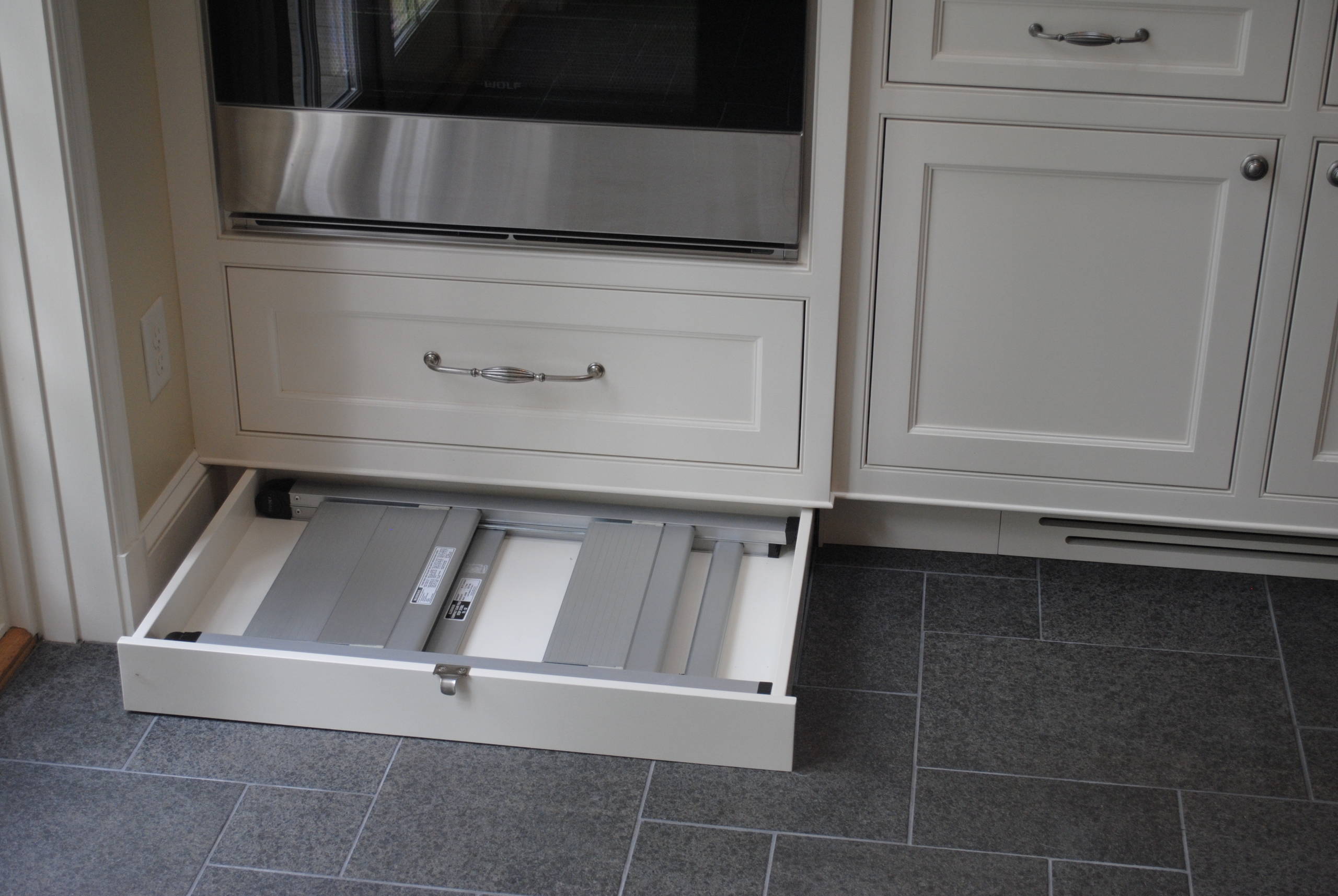 Besonders für kleine Küchen gilt: jeder Zentimeter muss vollständig genutzt werden. Mit einer Sockel- oder Tritt-Schublade lässt sich selbst unter der Küchenzeile noch Stauraum herausholen, der sich für große, flache Gegenstände anbietet, die nicht oft gebraucht werden. So zum Beispiel für Servierplatten, Kuchenbleche oder sogar, wie hier zu sehen, für eine kleine Klappleiter, mit der man an hohe Wandschränke herankommt.