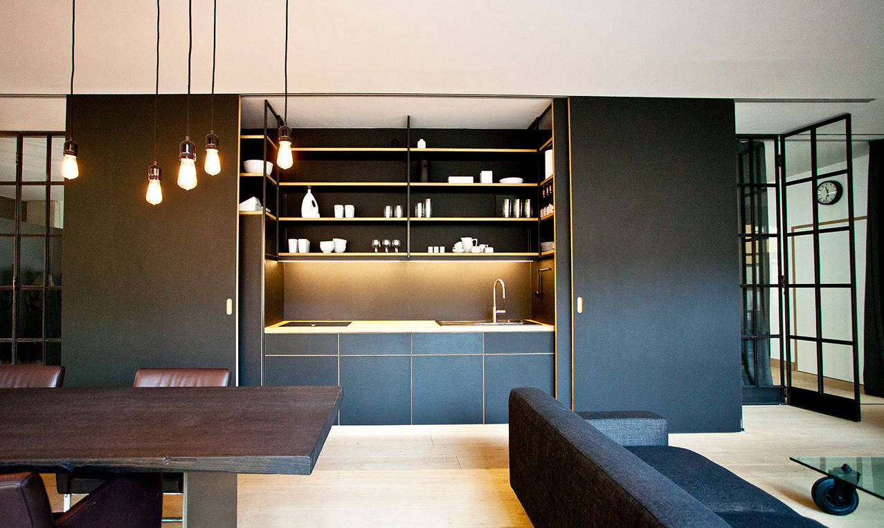 Ein Problem von Küchen im offenen Wohnraum: Es sieht nach dem Kochen nicht unbedingt ordentlich auf der Arbeitsfläche aus. Statt das Chaos unter den Teppich zu kehren, verschwindet auch in diesem Müncher Loftgebäude von Aigner Architekten die gesamte Küchenzeile hinter großen Schiebetüren.