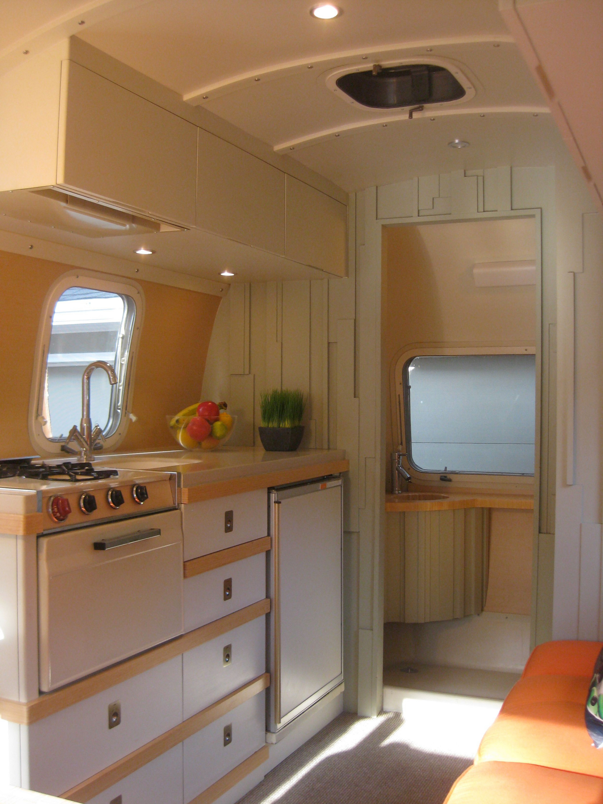 Auch in Wohnmobilen wird auf engstem Raum gekocht. Da braucht es eine Miniküche mit Kühlschrank, Herd, Ofen und maximalem Stauraum – wie auch in diesem Airstream von 1971. Bei der Restaurierung konnte Designerin Amy Carman die Kücheneinrichtung detailgetreu erneuern.