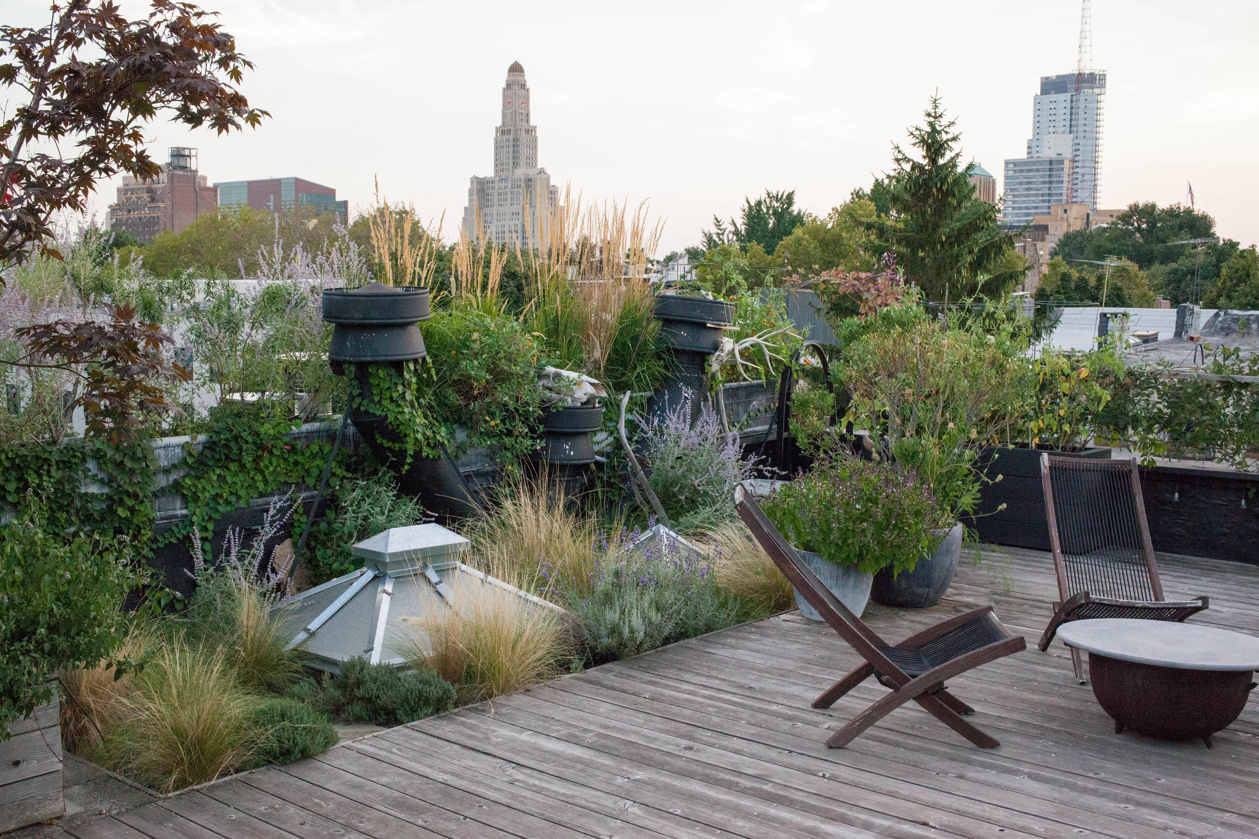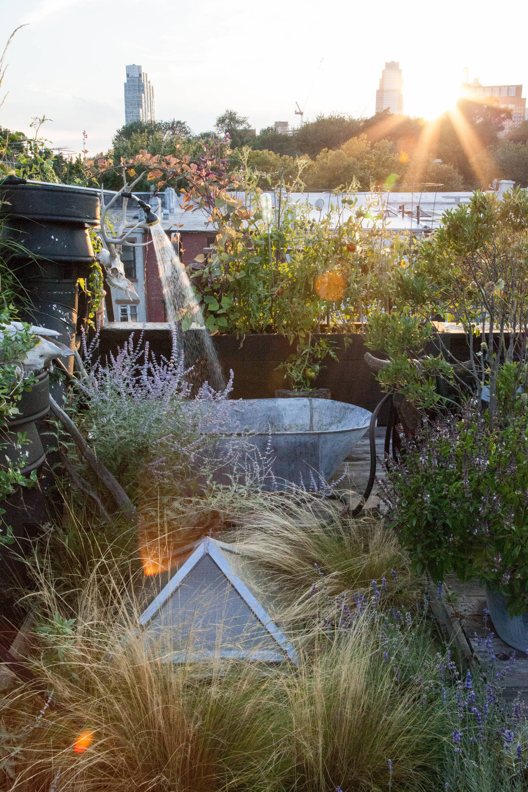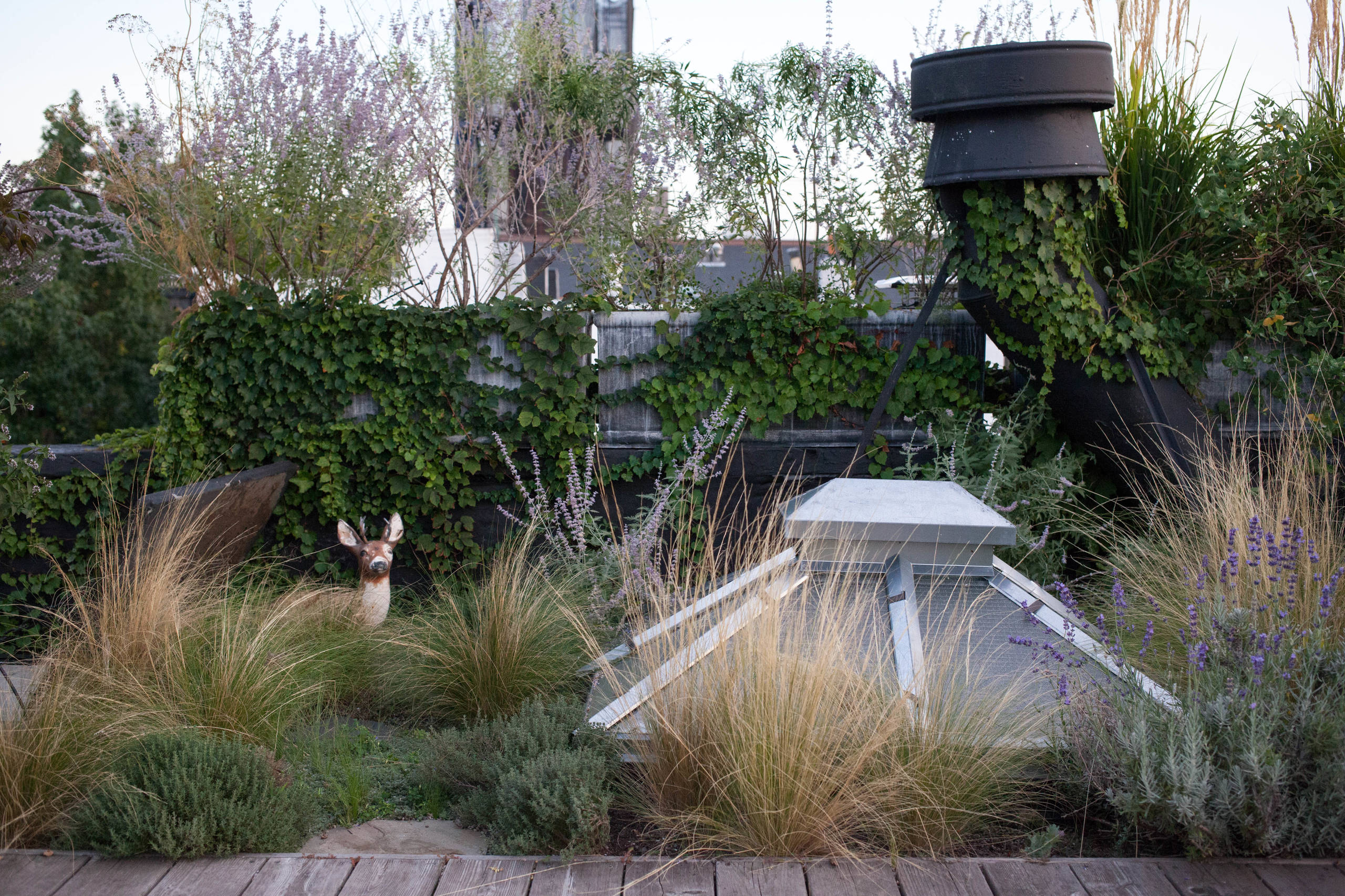 Auf einem New Yorker Dach schuf sich ein Landschaftsarchitekt eine grüne Oase. Dort entspannt er mit Freunden, Filmen – und einem Beton-Reh