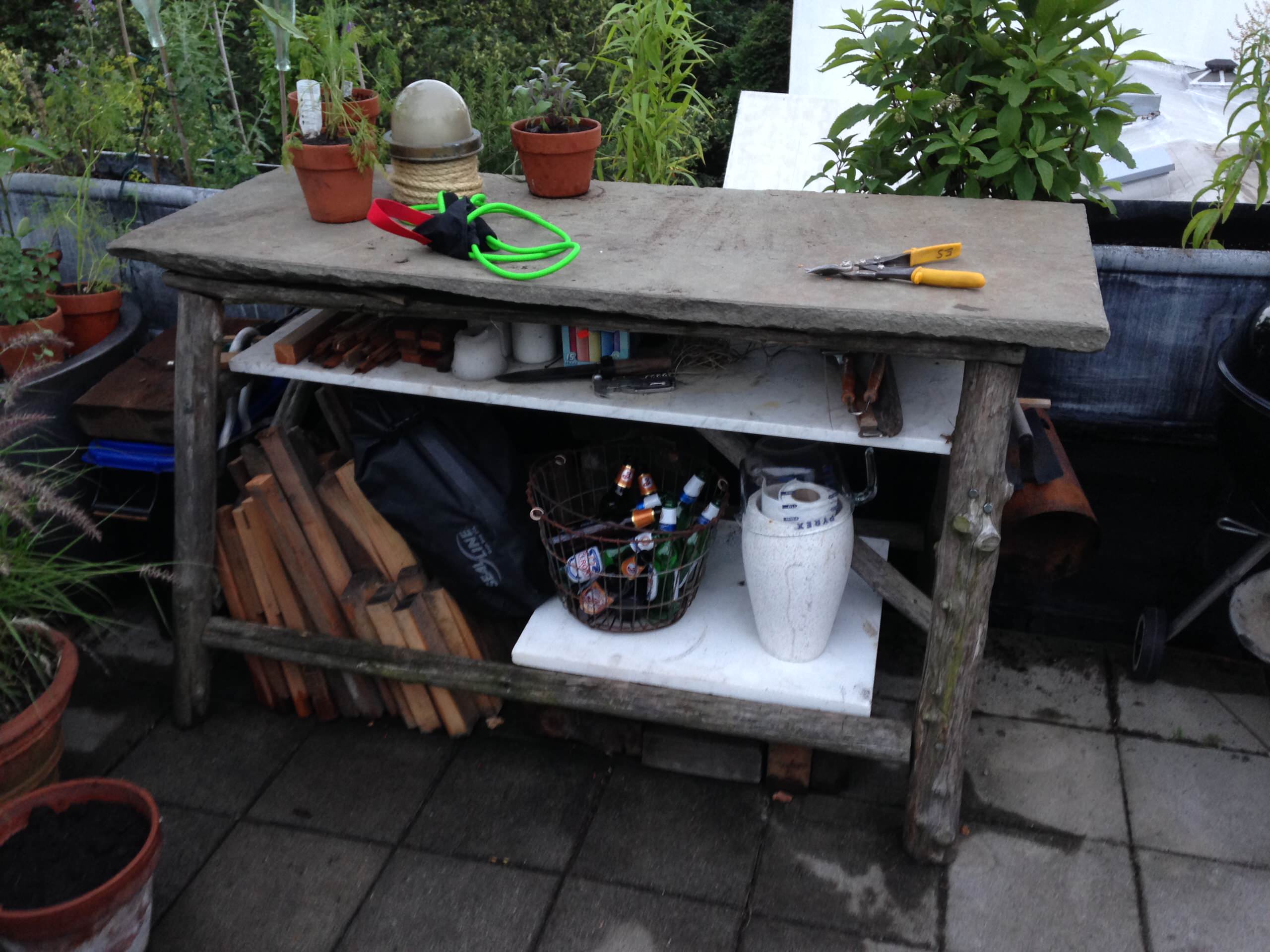 Die Pflanzbank hat Klausing ebenfalls selbst gebaut. Sie besteht aus einer Basaltplatte, die er auf einem Hinterhof in Brooklyn fand und Ästen, die er lediglich mit einer Handsäge und einer Zange in Form brachte.