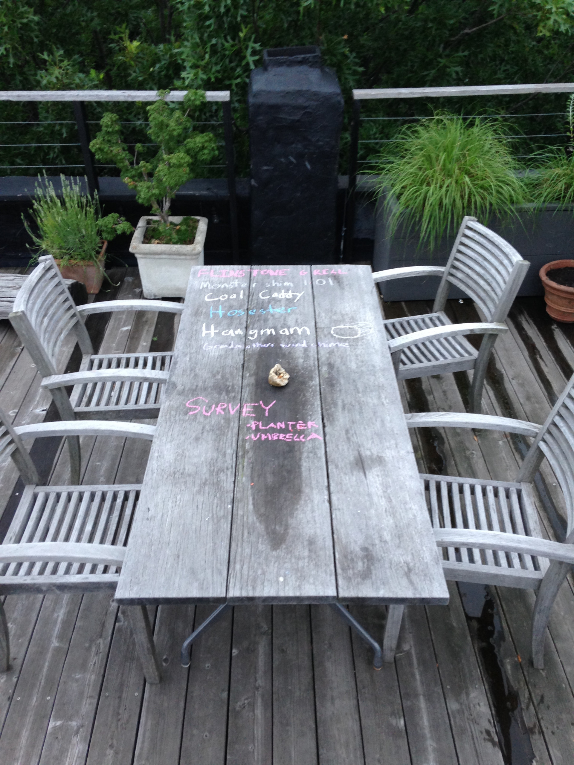 An anderen Abenden wird die Dachterrasse zum Esszimmer. Die Stühle von Crate & Barrel kombinierte Klausing mit einem selbst gebauten Esstisch aus Altholz. Fun Fact: Die dafür verwendeten Dielen lagen früher auf dem berühmten Coney Island Boardwalk!