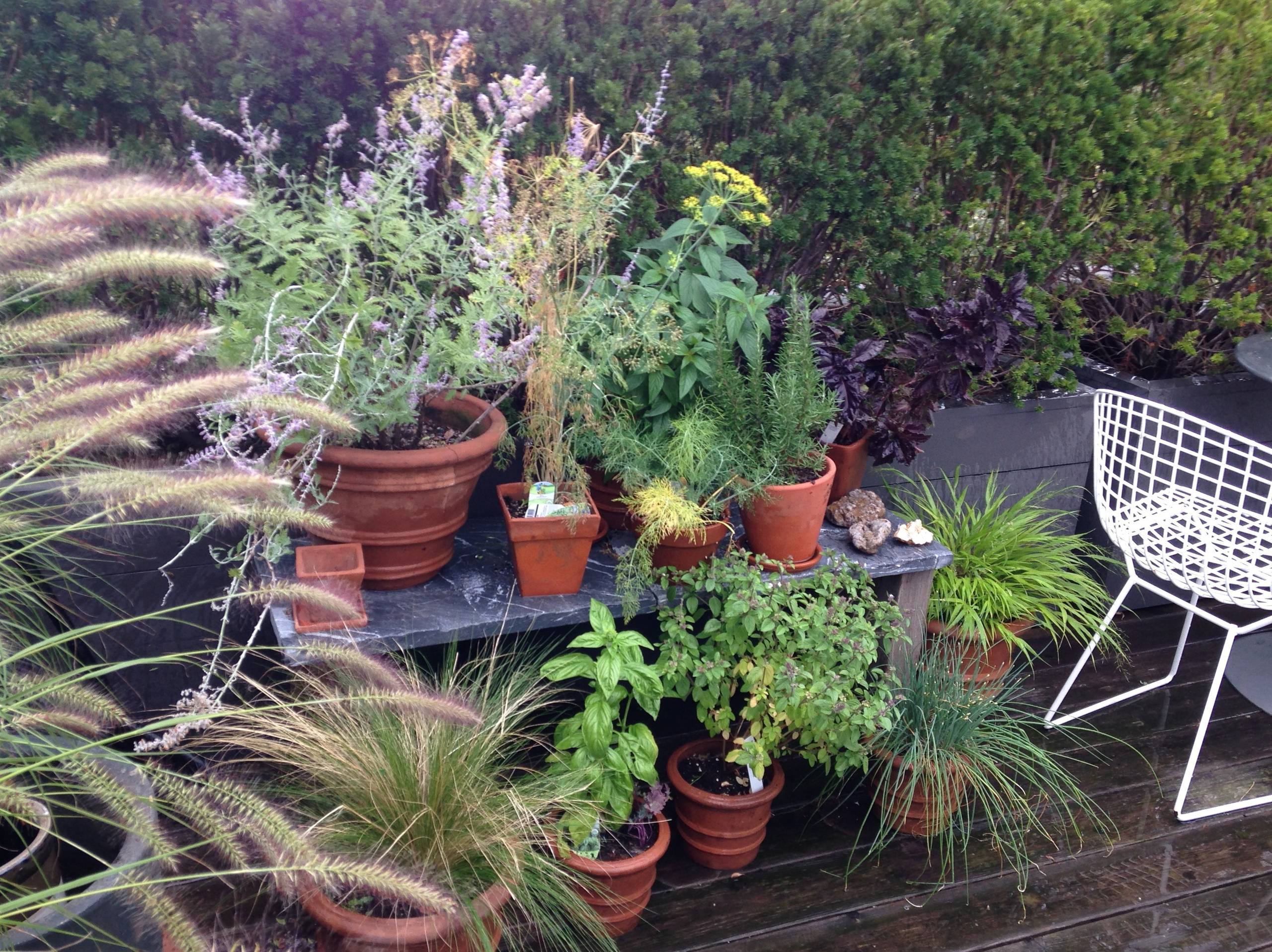 Im Sommer scheint den ganzen Tag über die Sonne auf die Dachterrasse; es herrschen gute Bedingungen für Kräuter und allerlei anderes essbares Grün, das Klausing in Terrakotta-Töpfen und Hochbeeten gepflanzt hat. „Ich habe hier oben meine Liebe zum Gärtnern wieder entdeckt. Ich hatte beinahe vergessen, wie viel Spaß das macht“, erzählt er. Obwohl der Garten relativ pflegeleicht ist, muss er oft gießen. „Weil Kübelpflanzen natürlich schneller austrocknen, brauchen sie viel Wasser, vor allem bei direkter Sonneneinstrahlung.“
