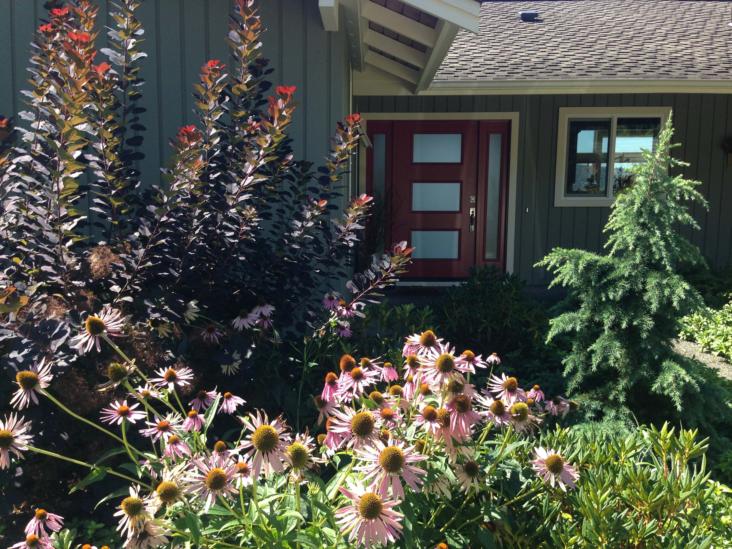 Eine Kombination aus Rottönen: Diese Eingangsbepflanzung aus einem roten Perückenstrauch (Cotinus), rosafarbenem Sonnenhut und der Eingangstür in Bordeaux bietet mindestens sechs Monate im Jahr einen tollen Anblick – und wer wird nicht gerne von freundlichen Blumen begrüßt, wenn er nach Hause kommt?