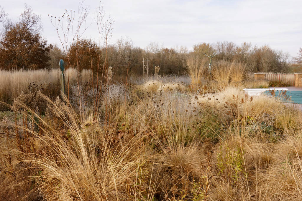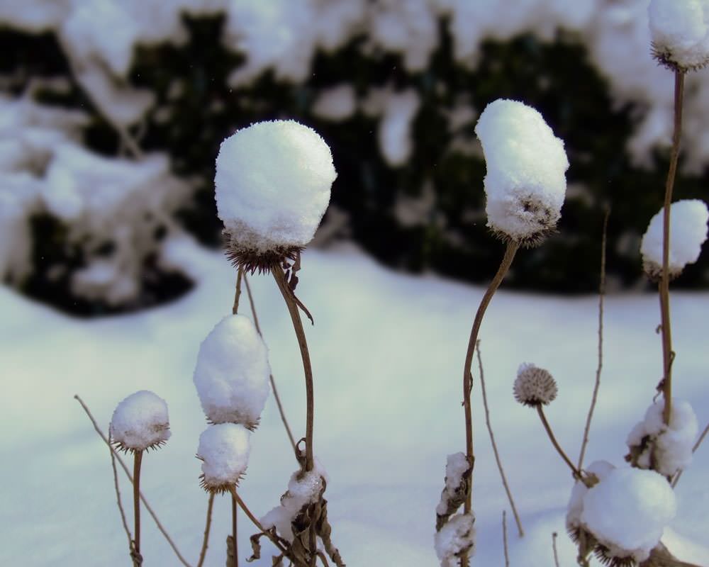 Diese Aufnahme und die nachfolgenden Bilder zeigen, wie gut die Blumen auf eine üppige Wildpflanzenwiese passen – nicht nur in der farbenfrohen Blütezeit, sondern auch im Spätherbst, wenn sie die erdigen Töne verstärken, und sogar im Winter, wenn sie aus dem Schnee gucken.