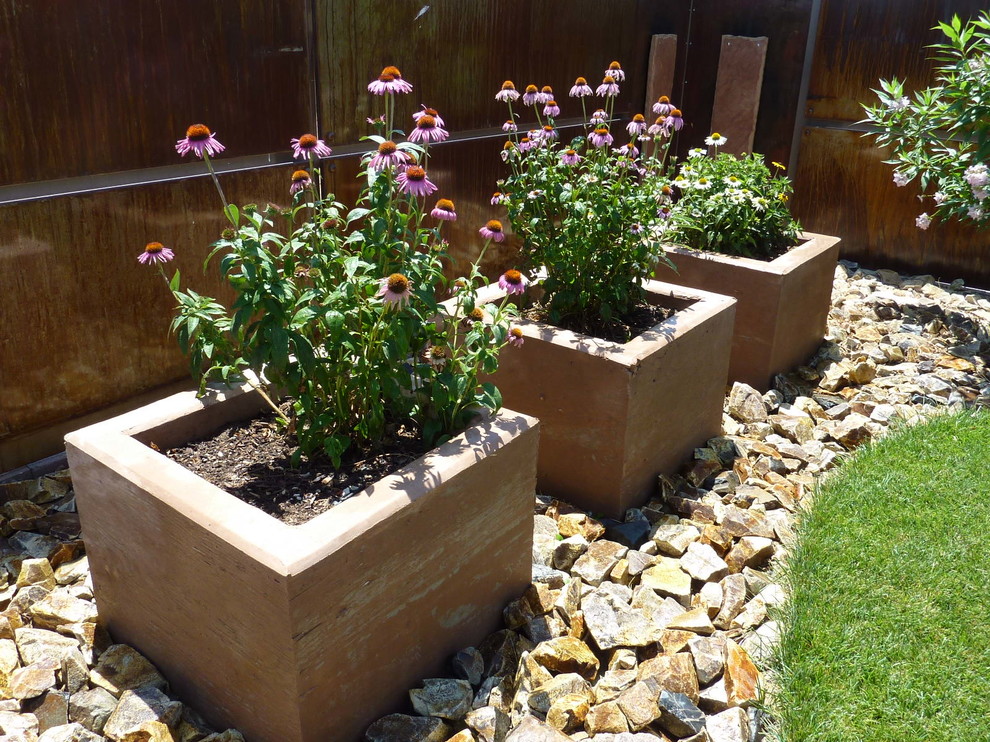 Echinacea-Arten und Hybridsorten eignen sich hervorragend zur Bepflanzung von Kübeln. Auch hier müssen sie nicht besonders aufwändig gepflegt werden. Ob als Einzelpflanze, wie in diesem Beispiel, oder in Kombination mit anderen, niedrigeren Pflanzen an der Seite, um sie hervorzuheben. Probieren Sie es aus – zum Beispiel mit Zierlauch, Goldmajoran (Origanum vulgare ‘Aureum’) oder einem büschelartig wachsenden Gras wie Blauschwingel.