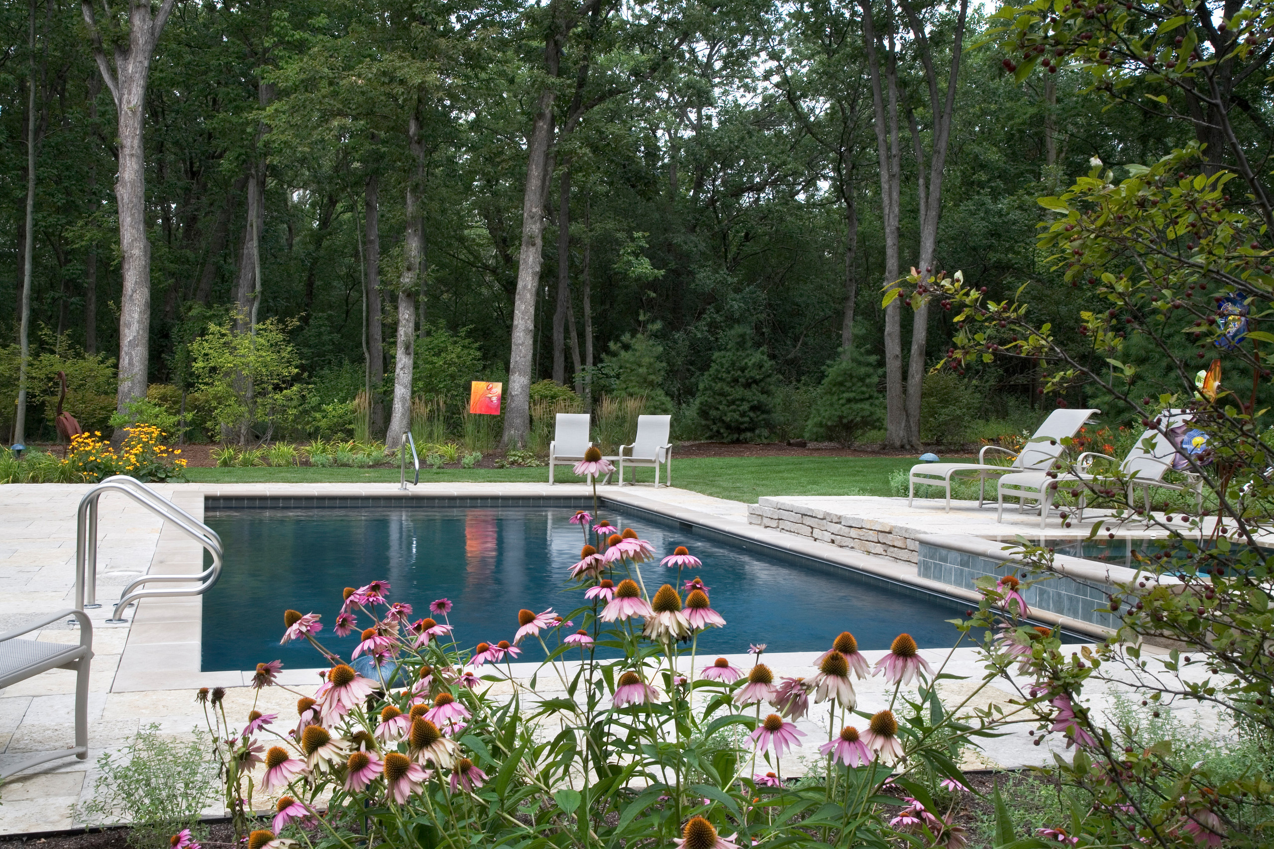 Neben einem Schwimmbecken ist die Umgebung oft schattenlos – eine trockene, umbarmherzige Umgebung für Pflanzen. Echinacea hält es hier locker aus. Nutzen Sie die Zähigkeit der Pflanze und pflanzen Sie einen Vorhang aus Sonnenhüten!