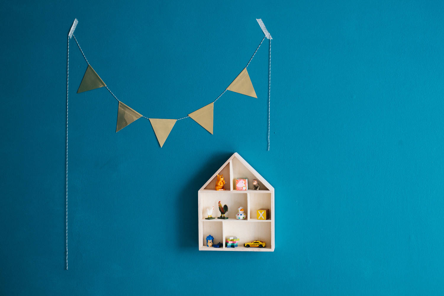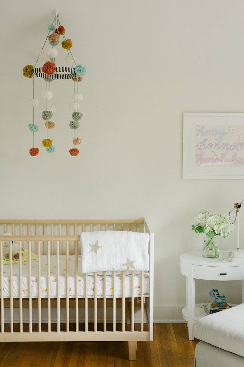 Sie hat beinah schon Must-Have-Status im Babyzimmer bekommen: die Wimpelkette. Statt lange Nähstunden oder viel Geld zu investieren, können Sie eine Wimpelkette aus Schnur und Geschenkpapier im Handumdrehen selber machen. Schneiden Sie dafür ein Stück Schnur nach Bedarf zu. Die Wimpel basteln Sie aus einem großen Papierbogen, der farblich zum Kinderzimmer passt. Einfach genug Rauten ausschneiden, in der Mitte umfalten und mit der Schnur dazwischen zusammenkleben. Die Kette können Sie anschließend quer durch den Raum spannen oder – wie hier im Kinderzimmer bei Isabel Robles Salgado – mit Maskingtape an der Wand befestigen.