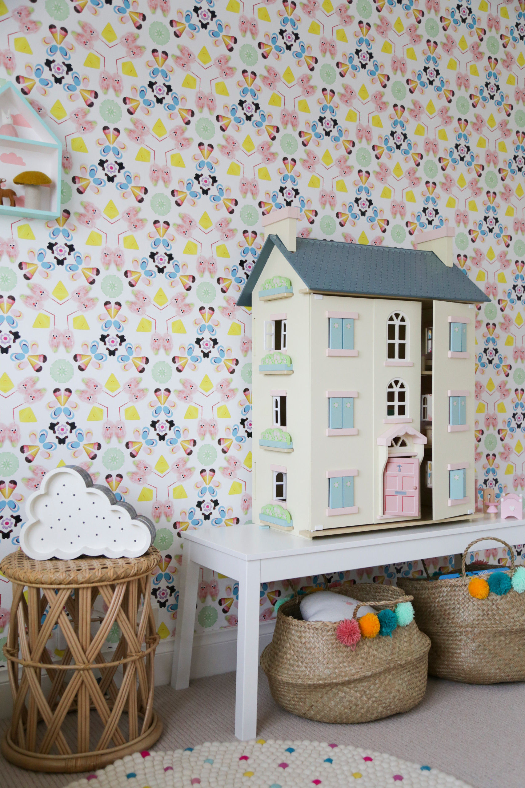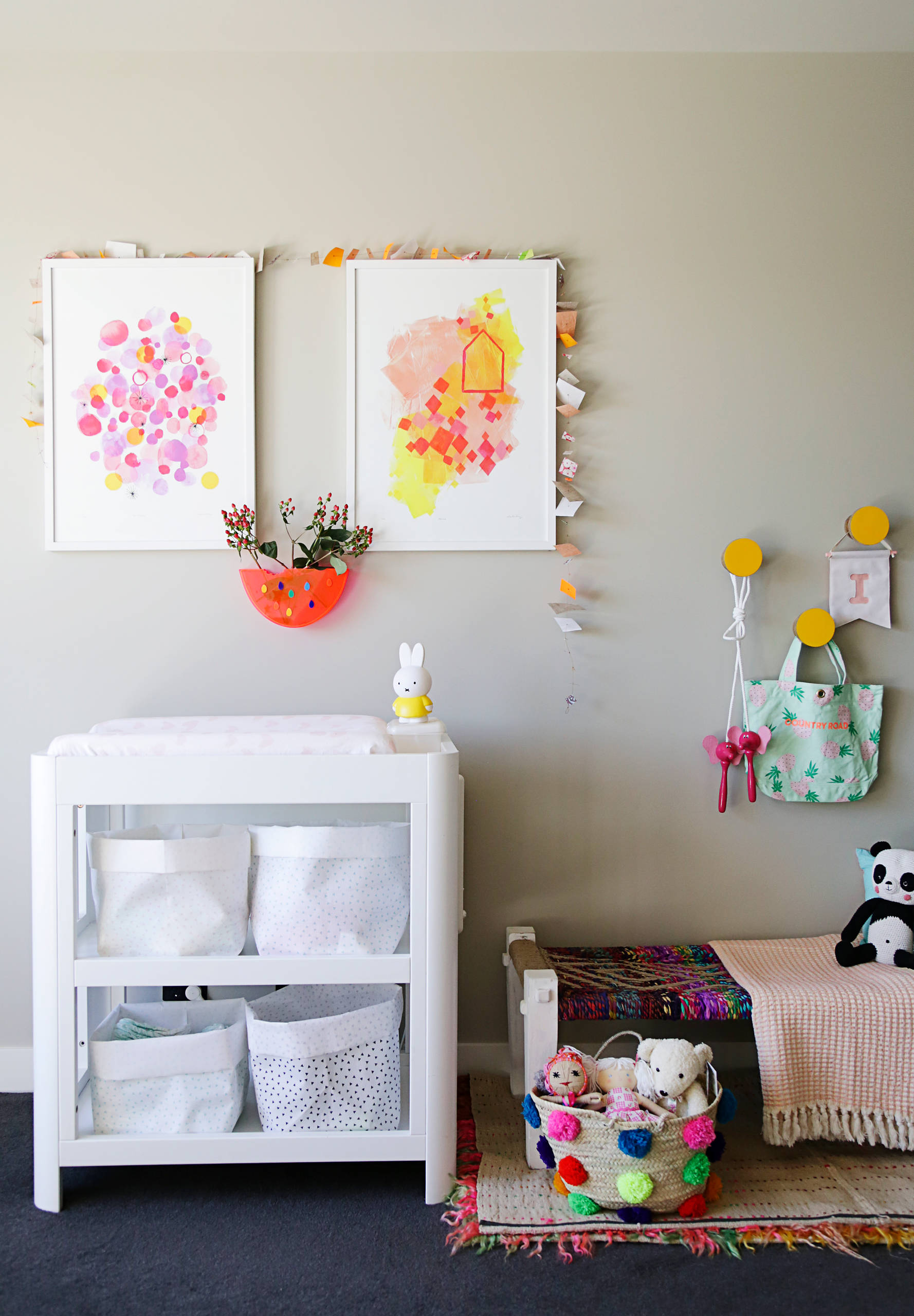 Mit Pompoms können Sie klassischen Flechtkörben aus dem Wohnzimmer Kinderzimmer-Style verpassen. Nähen Sie wie in diesem australischen Mädchenzimmer, gestaltet von Hide & Sleep Interior Design, drei oder vier Bommeln in verschiedenen Farben vorne an die Körbe an – ganz egal, ob selbstgemachte oder fertig gekaufte Pompoms.