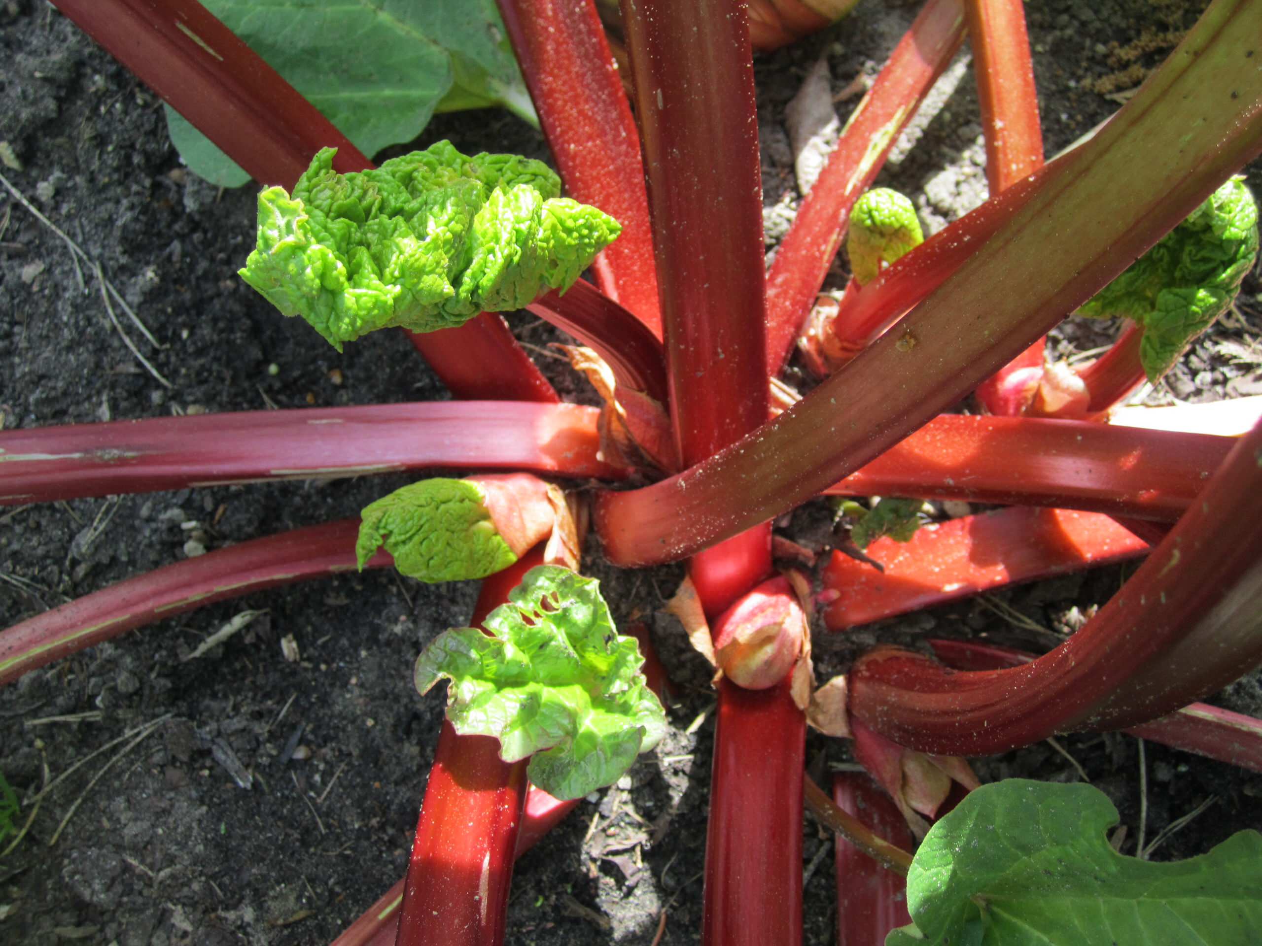 Blätter, die nach der Ernte neu wachsen, bleiben als Schmuck einfach stehen und vergehen mit den ersten Frösten. Dann kann man sie einfach abharken, die Umgebung um das Herz der Pflanze säubern – und im nächsten Frühling wieder staunen, wie rot und groß die Stängel und Blätter aus der Erde kommen.