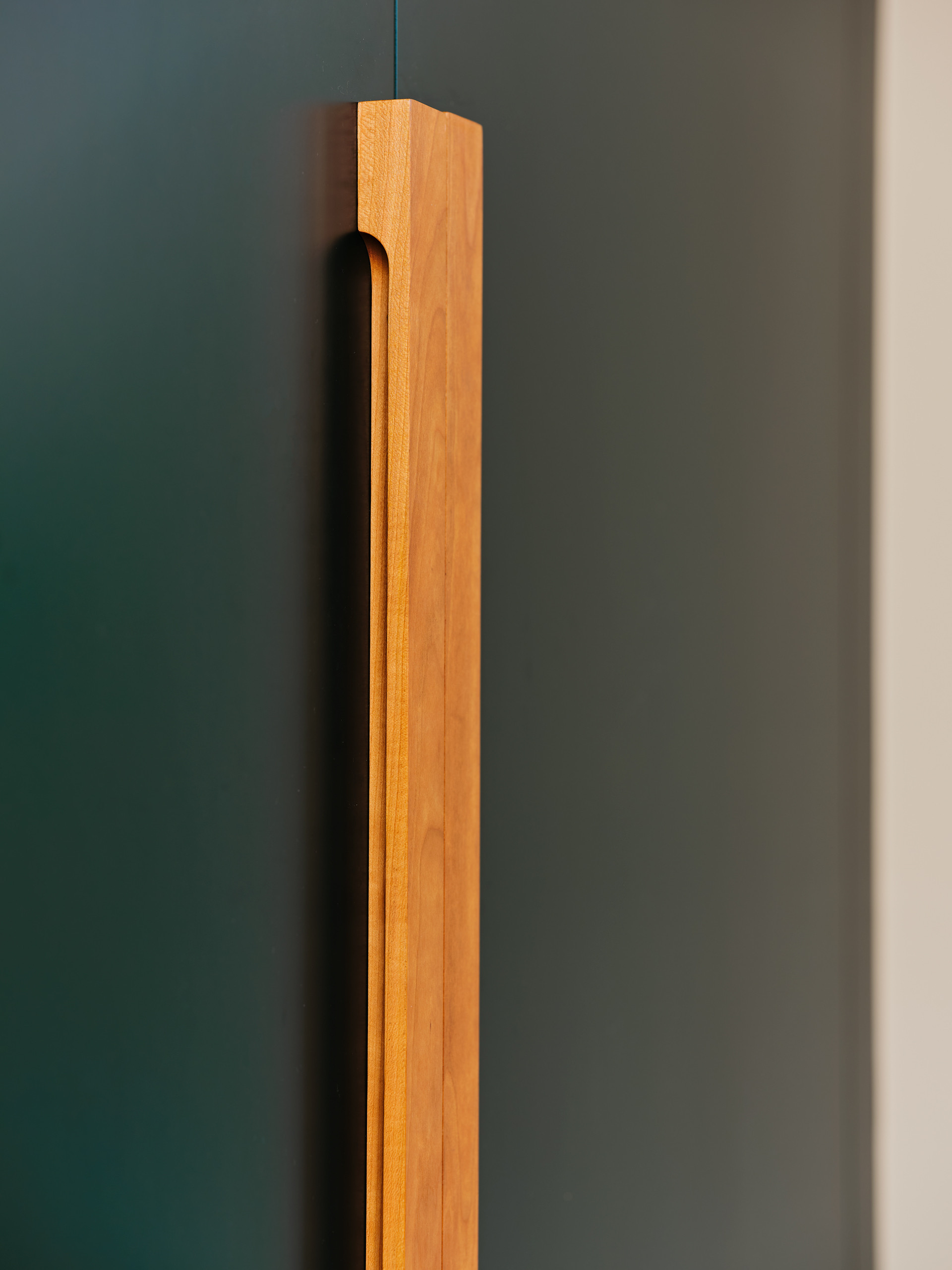 Die Expertin entwarf die Griffe aus Massivholz für die Schranktüren. „Sie war eine wirklich tolle Kundin, da sie interessante Ideen hatte und auf die Wiederverwendung von Gegenständen bedacht war“, erzählt Evans. „Sie ist mit dem Endergebnis sehr zufrieden.“