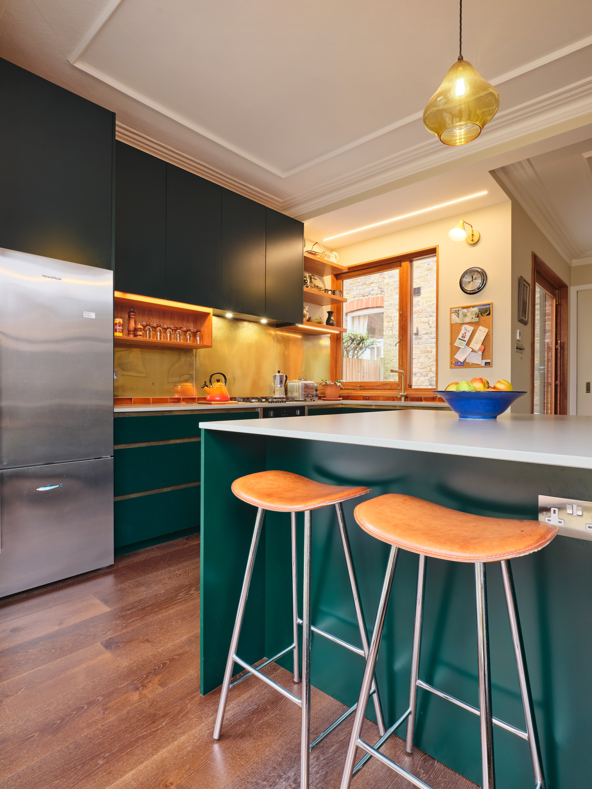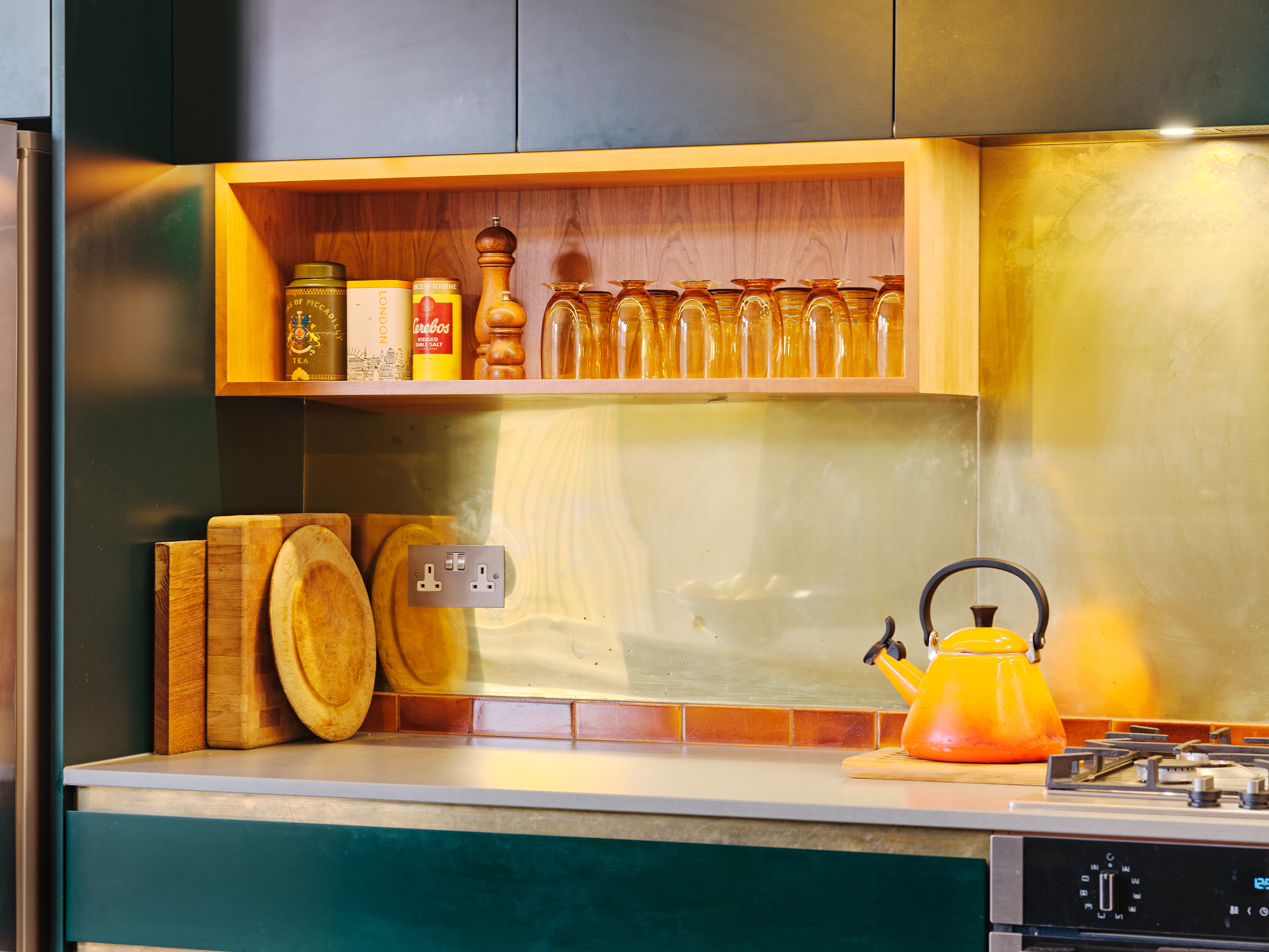 Die Eigentümerin hatte sich für einen Spritzschutz aus Messing entschieden. Sie setzt einen hellen Akzent zu den dunkelgrünen Schränken und dem warmen Holz. Einige Terrakotta-Kaminfliesen von einer anderen Stelle des Hauses wurden als Aufsatz wiederverwendet.