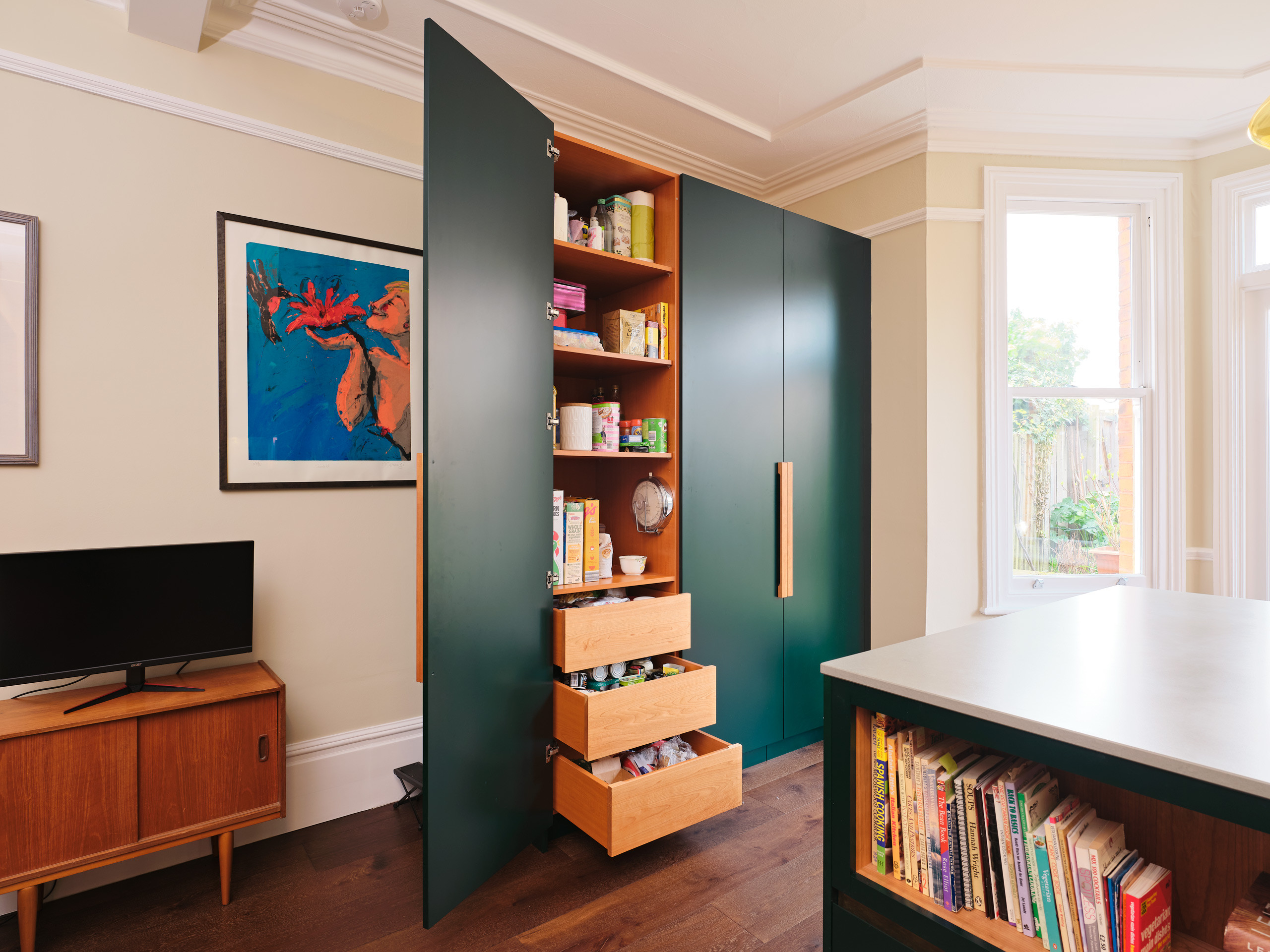 Eine interessante Farb- und Materialwahl, sowie eine neue Speisekammer erwecken eine Küche zum Leben