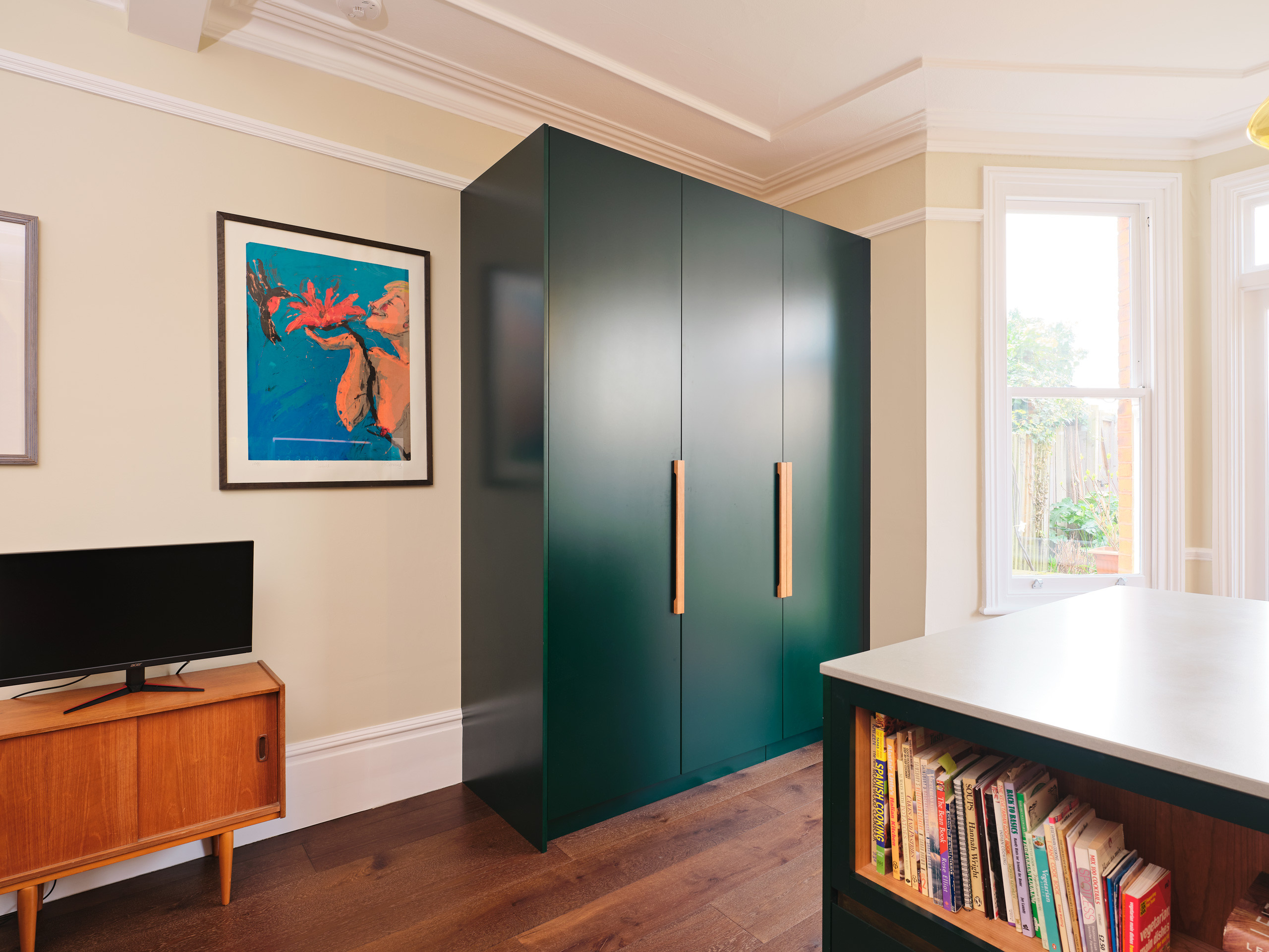 „Die Eigentümerin war daran interessiert, einzigartige Materialien und Farben zu verwenden“, erinnert sich Evans. „Sie hatte sich bereits ein kräftiges Grün ausgesucht, das wir für die Schränke farblich angepasst haben.“