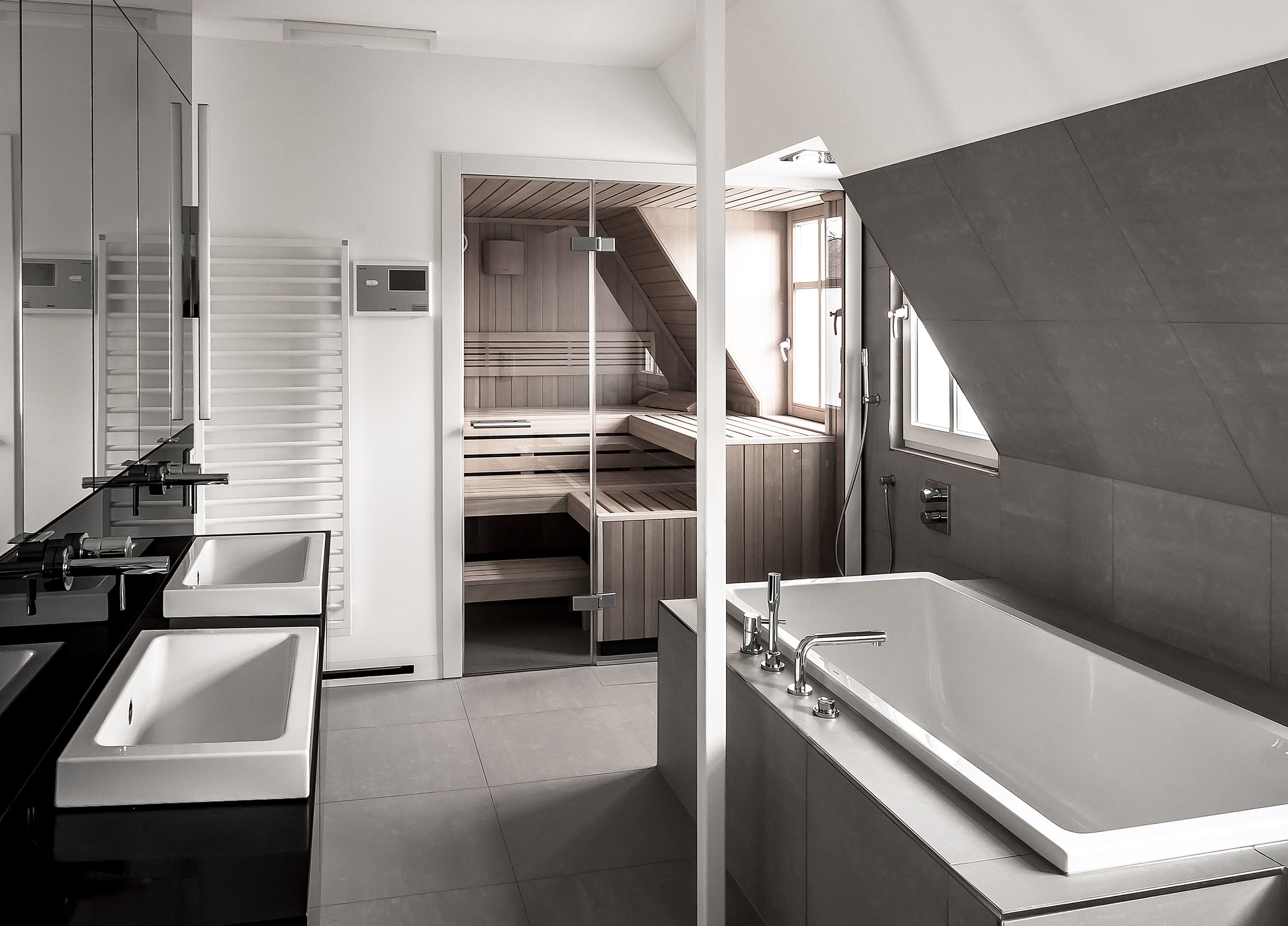 Unter dem Dach dieses Hauses installierte das Team vom Büro Pankrath im Familienbad auch eine kleine Heimsauna. Dank durchgängigem Fußboden und der Verglasung nimmt sie optisch nur wenig Platz ein