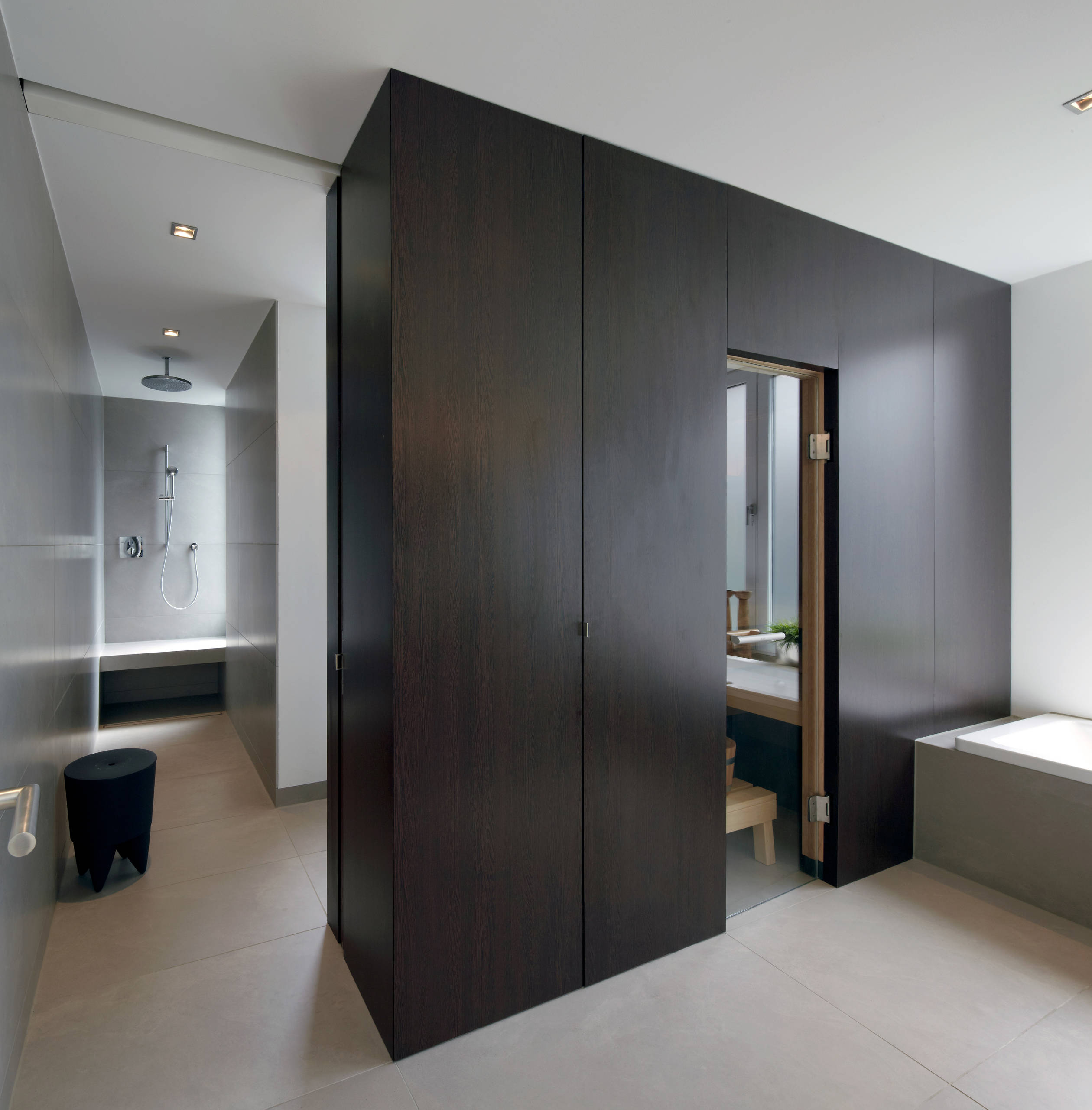In diesem Kölner Wohnhaus verbirgt sich die Sauna hinter einer dunklen Holzvertäfelung. Der Einbau trennt gleichzeitig den Duschbereich ab