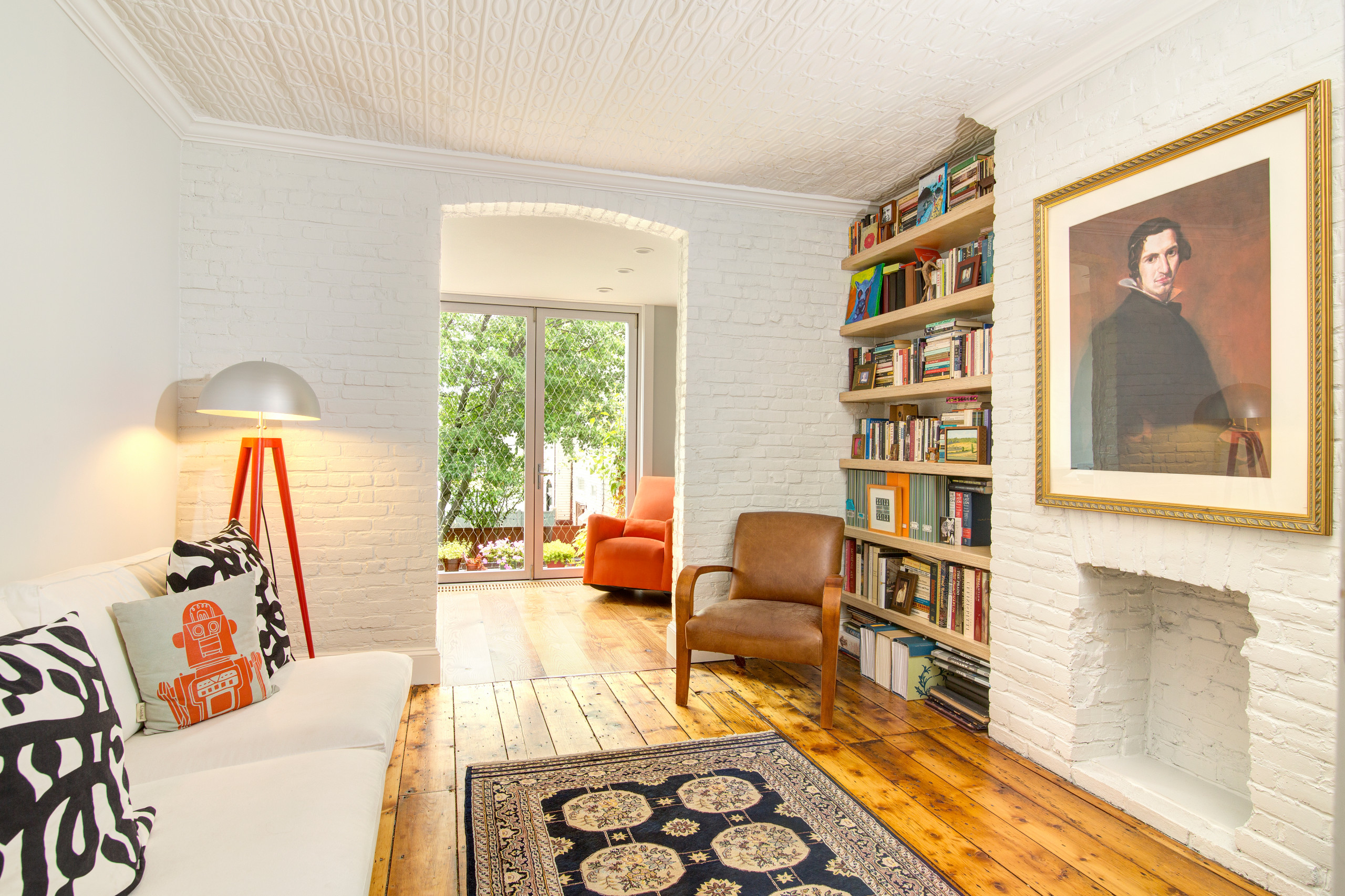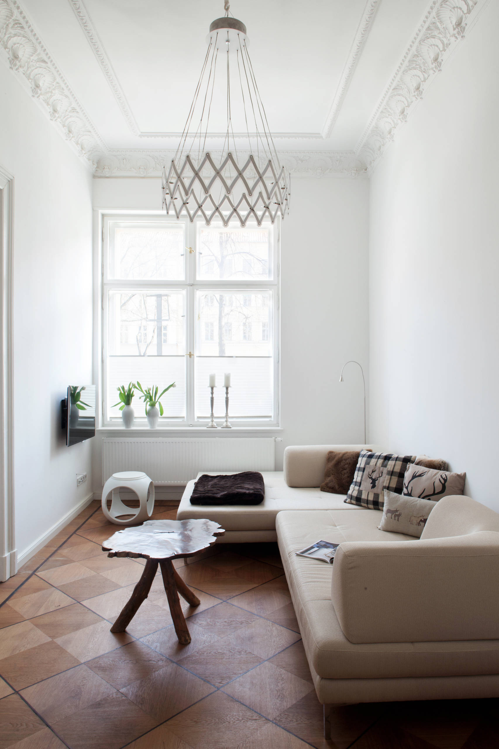 Weniger ist mehr – das zeigt auch die Einrichtung des schmalen Wohnzimmers in dieser Berliner Wohnung. Überlegen Sie, welche Möbel Sie wirklich benötigen und welche nur schmückendes Beiwerk sind. Brauchen Sie einen zusätzlichen Sessel? Macht sich die Bücherwand vielleicht auch gut in einem anderen Raum?