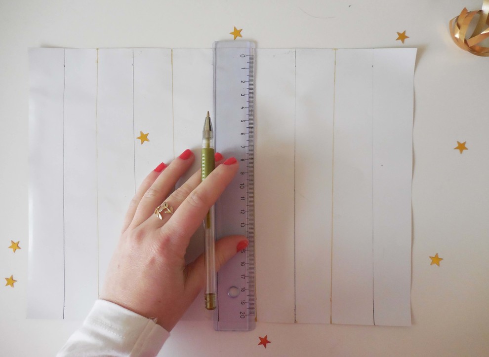 Zeichnen Sie auf der Rückseite der goldfarbenen Bastelpappe im Abstand von drei Zentimetern senkrechte Linie vor. Verwenden Sie dafür abwechselnd den schwarzen und goldfarbenen Stift.