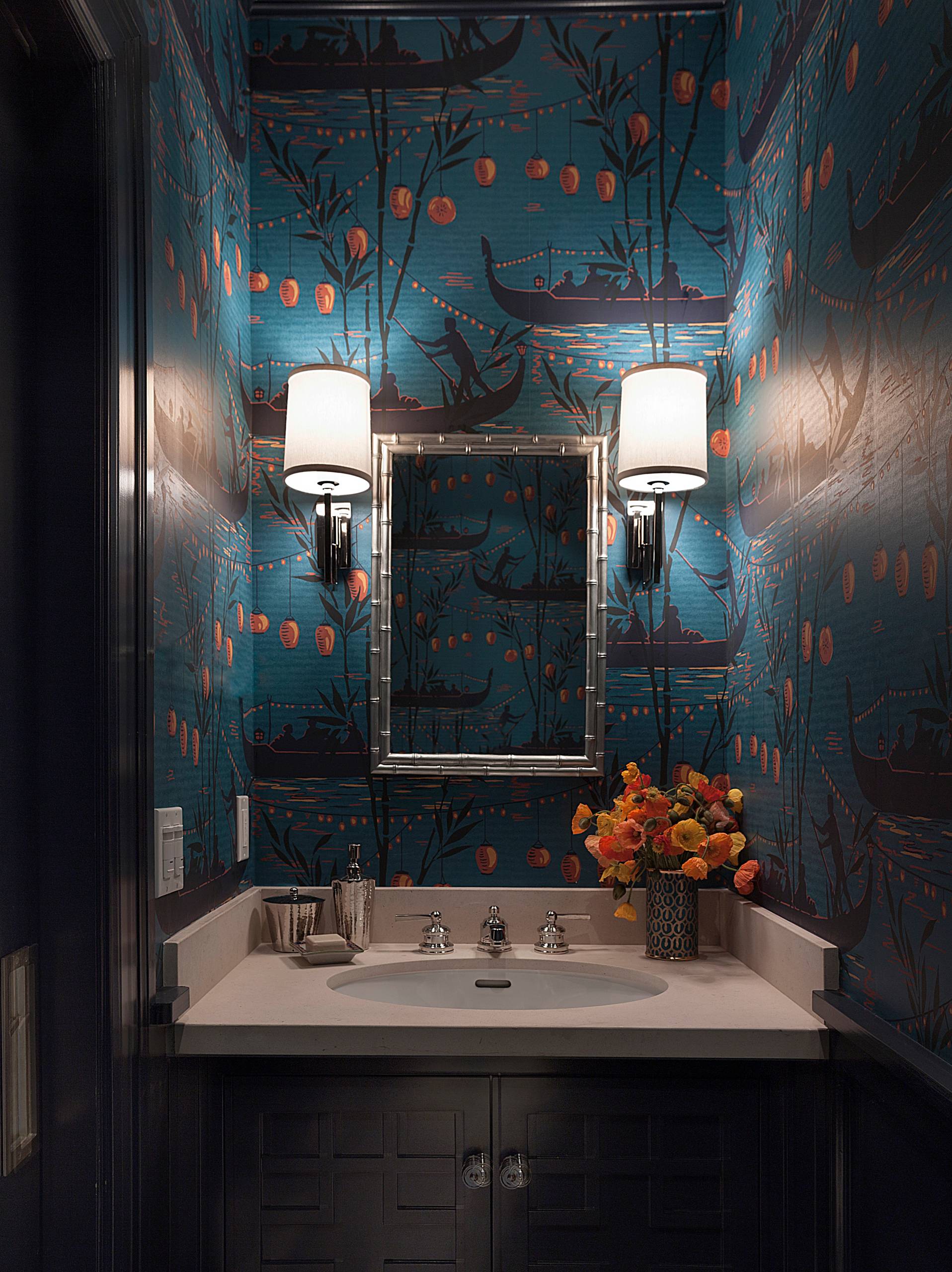 Aus einer Auswahl von vier Houzz-Design-Fotos als Vorlage für das neue Zimmer hat sich die Mehrheit der Teilnehmer für Lowengarts Badezimmer entschieden. Mit seinen tiefblauen Wänden, stilvollen Oberflächen und warmen Akzenten passt der Raum perfekt zum prachtvollen Stil der Cluedo-Villa und verleiht ihr zugleich einen modernen Twist. „Ich finde, es passt perfekt, weil es eine gewisse Seriosität ausstrahlt. Vor allem die Tapete unterstreicht den formellen Charakter“, so Lowengart von Ann Lowengart Interiors. „Es wirkt sehr europäisch und passt perfekt in die Zeit, aber es bringt eine frische Note ins Spiel.“
