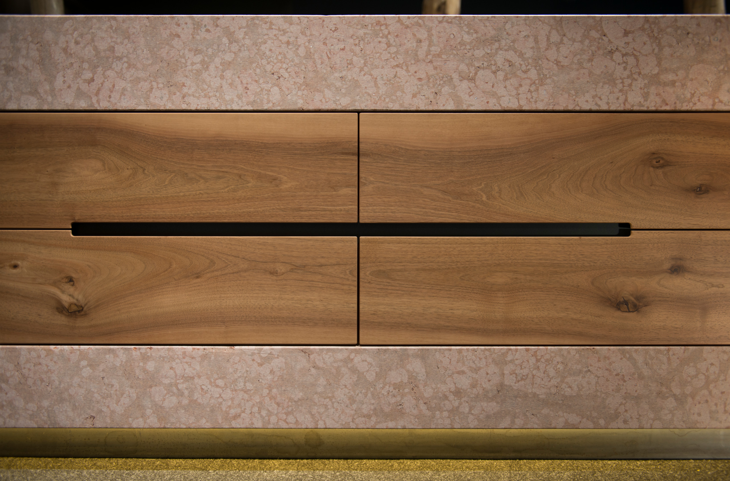 Ein Beispiel für rötlichen Marmor sehen wir in dieser Küche von Werkhaus. Die Farbe, wie zum Beispiel beim bekannten „Veroneser Marmor“ (ienem Knollenkalk) wird in der Regel durch Hämatit und andere eisenhaltige Minerale erzeugt.
