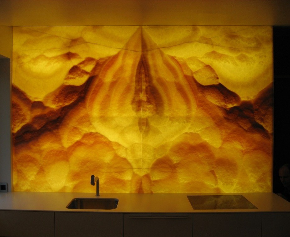 Onyx-Marmore sind transluzent – im Gegenlicht entfaltet sich so eine beeindruckende ästhetische Kraft, die schon Architekten der Gotik erkannten. Eines der schönsten Lichtspiele dieser Art findet man im 1288 erbauten Dom von Orvieto, wo man ihn für ein Kirchenfenster verwendete. Auch heute setzt man ihn mitunter für Lampenschirme oder hinterleuchtete Wandflächen ein.