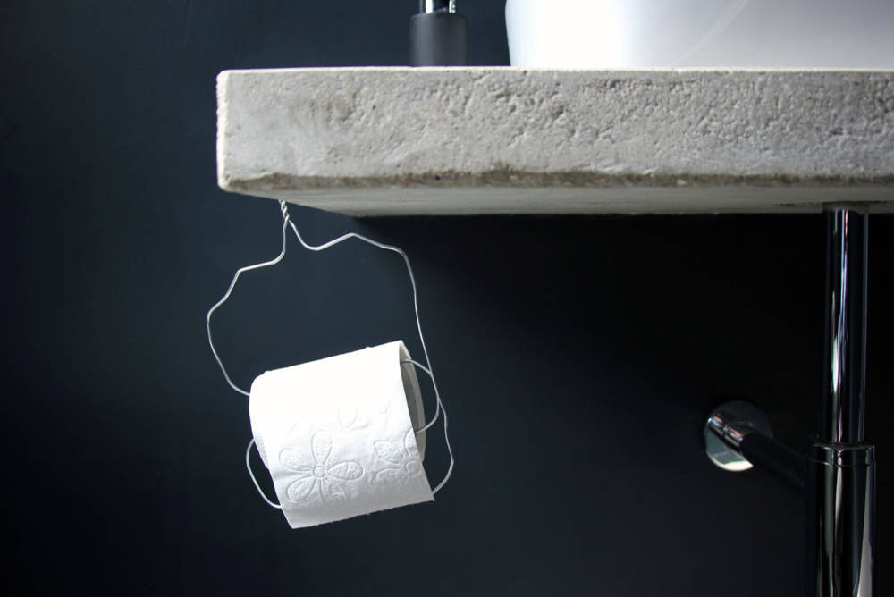 … hat längst begriffen, dass der Kleiderbügel mehr kann als bloß heiße Kleidchen aufhängen. Ein bisschen DIY und schon ist er auch schon zum coolen Toilettenpapierhalter umfunktioniert. So einfach ans Beton-Waschbecken gehängt, sieht er doch recht lässig aus – und der Clou, wenn es nicht mehr gefällt, nimmt man ihn halt wieder ab.