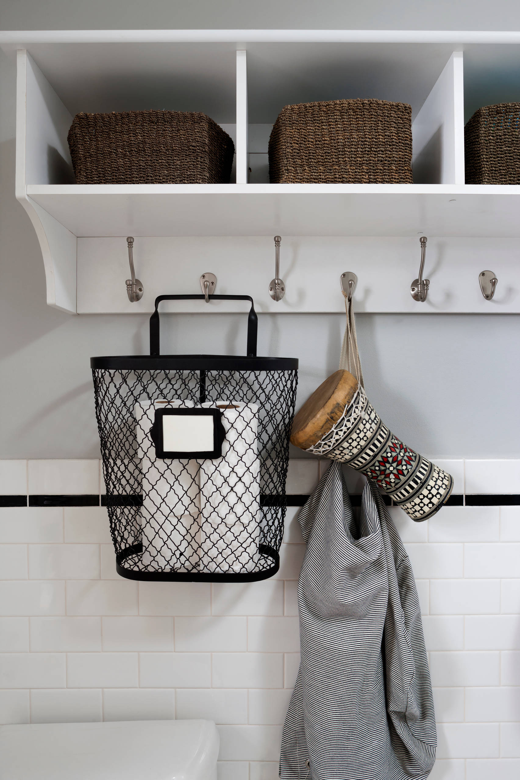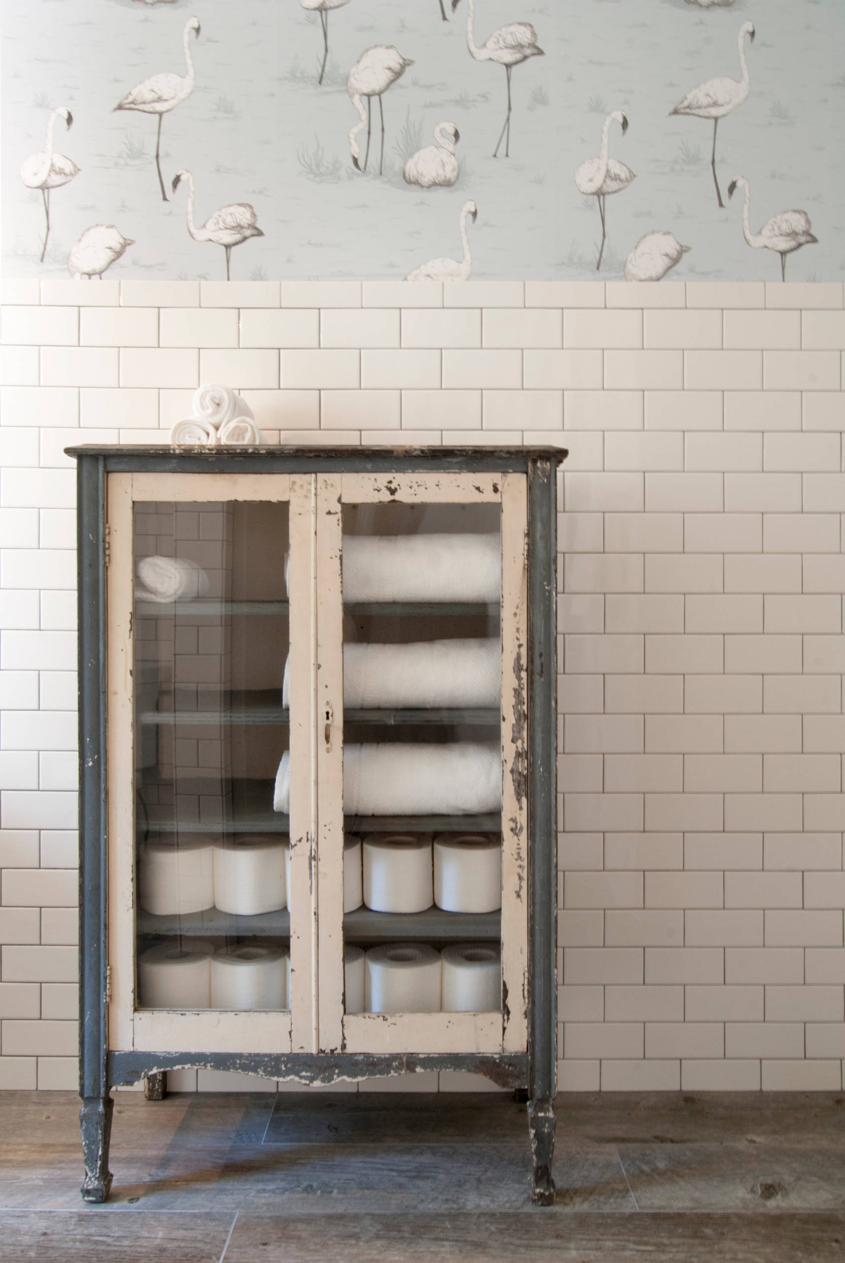 Verstaut das Toilettenpapier nach wie vor am liebsten klassisch, und zwar im Badschrank. Aber eben nicht versteckt, sondern ordentlich aufgereiht. Das hübsche Schränkchen ist ein Hingucker, ebenso wie die Wanddeko aus Fließen und Motiv-Tapete.