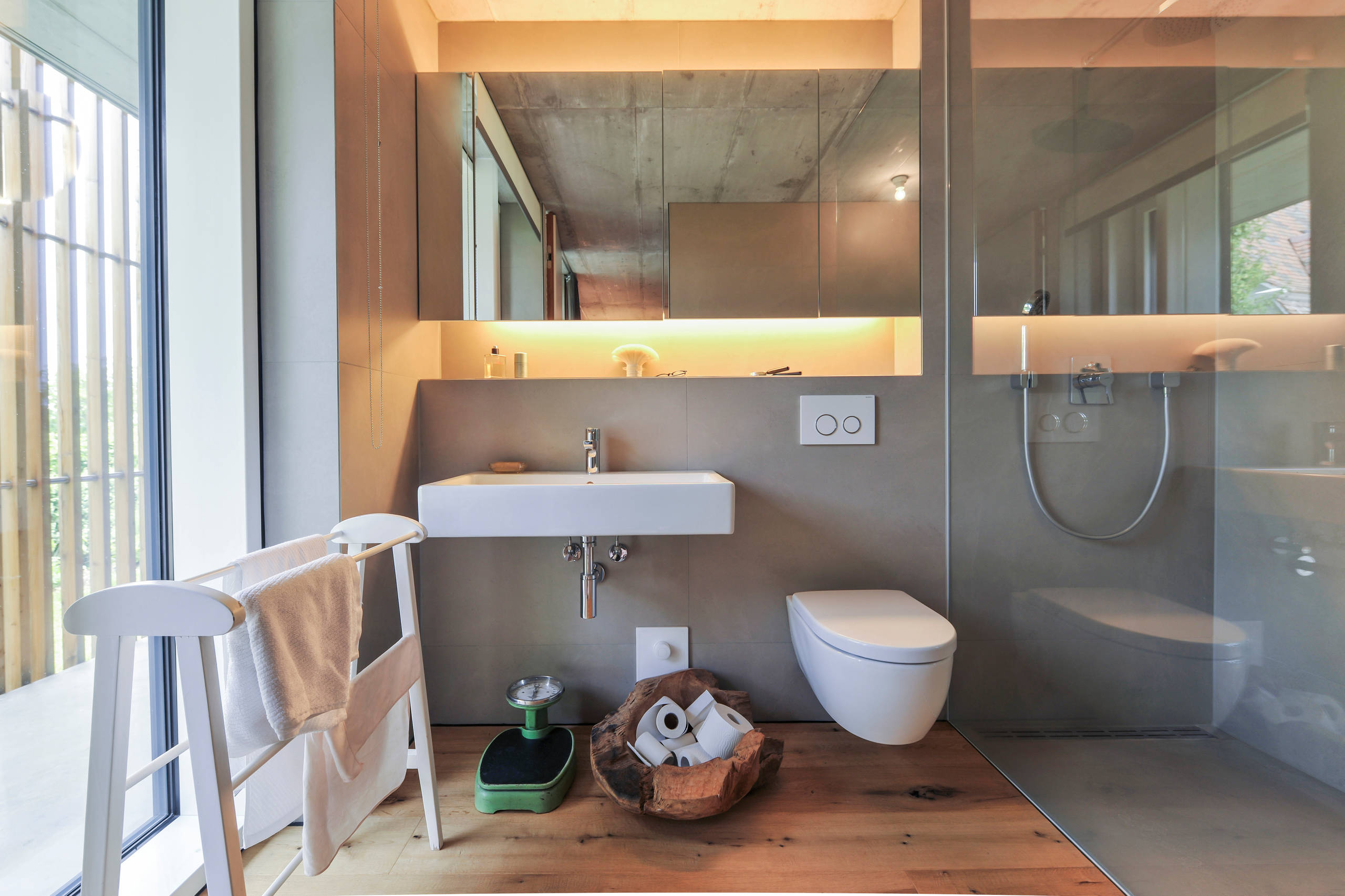 Gerade Linien, exklusive Hölzer: der luxuriöse Typ mag es hochwertig. Neben der fugenlosen Dusche, dem indirekten Licht und der hochwertigen Badkeramik werden sogar die – natürlich erstklassigen –Toilettenrollen in einem edlen Holzkorb aufgebahrt.